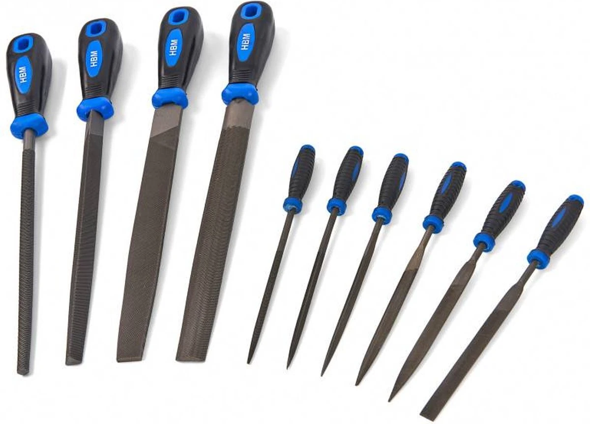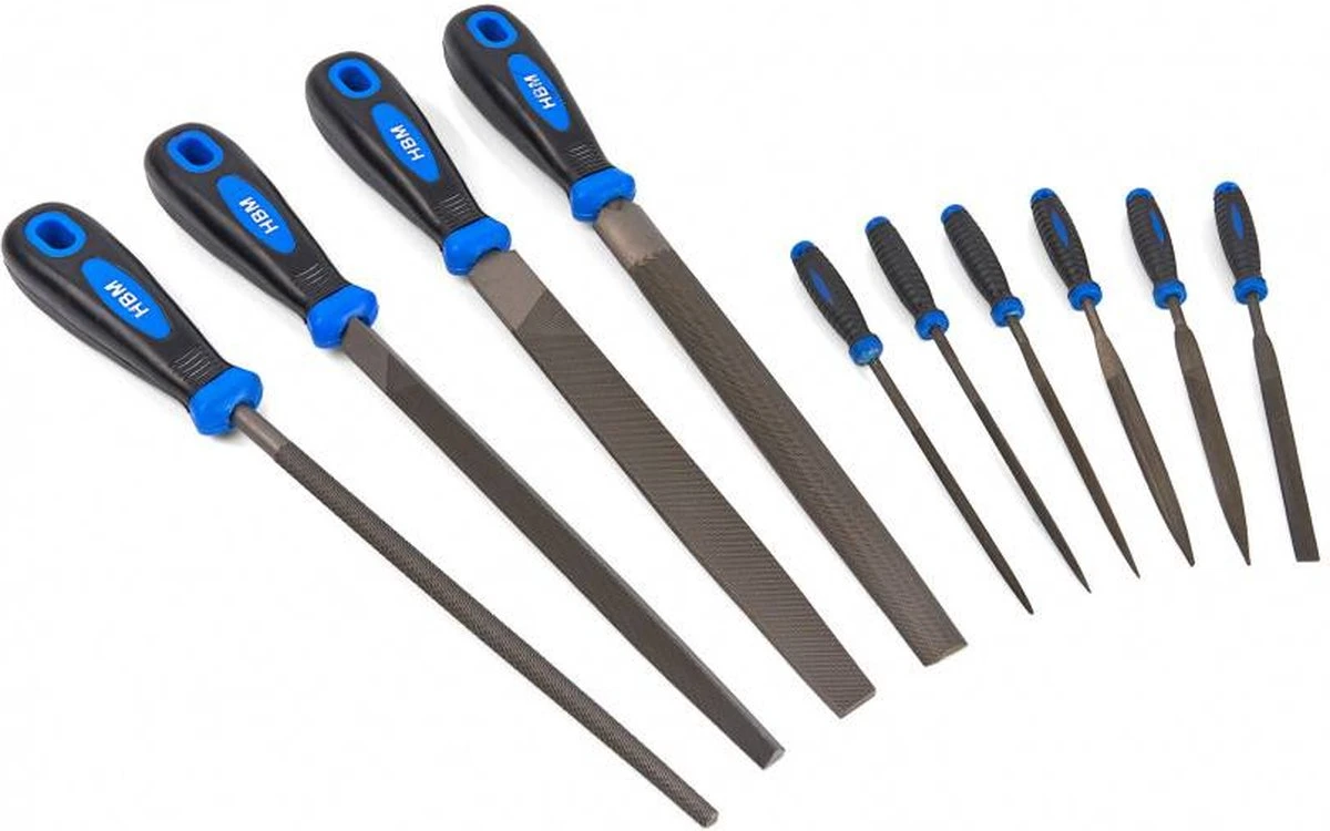 Een kunststof handvat op elke vijl geeft je meer controle tijdens het werken. Dit is vooral van belang als het gaat om kleine, kwetsbare metalen onderdelen. De vormen van de vijlen gaan van rond tot vlak, driehoek, halfrond, vierkant en vlakstomp. Op die manier heb je voor elk type vijlwerk het perfecte materiaal bij de hand. Dankzij de lengte kan je ook grotere oppervlakken makkelijk vijlen. Stuk voor stuk zijn de vijlen voorzien van een strakke, blauwe handgreep.