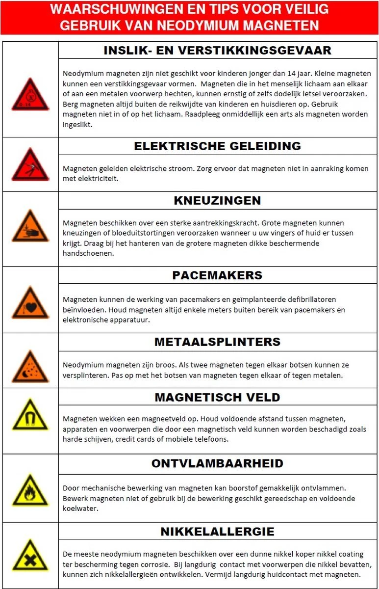 Dit type blokmagneet is door zijn grote en type 1 van de sterkst mogelijke magneet van zijn soort, denk dus goed om uw vingers. Dit product is niet geschikt voor kleine kinderen. Gebruik door volwassenen of onder toezicht van raden wij sterk aan. Vermijdt ook contact met uw elektronische apparatuur (zoals uw laptop, telefoon, tv etc.)