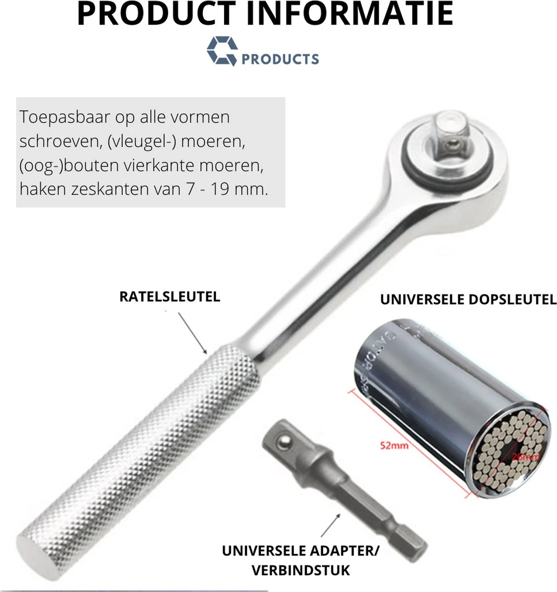 Bespaar uzelf de hoofdpijn die u krijgt van het doorspitten van uw gereedschapskoffer op zoek naar juiste maat (dop-) sleutel. Bevestig simpelweg de universele dopsleutel op de bijgeleverde ratelsleutel, of op de powertool die u bezit, en ga zonder enige moeite aan de slag.