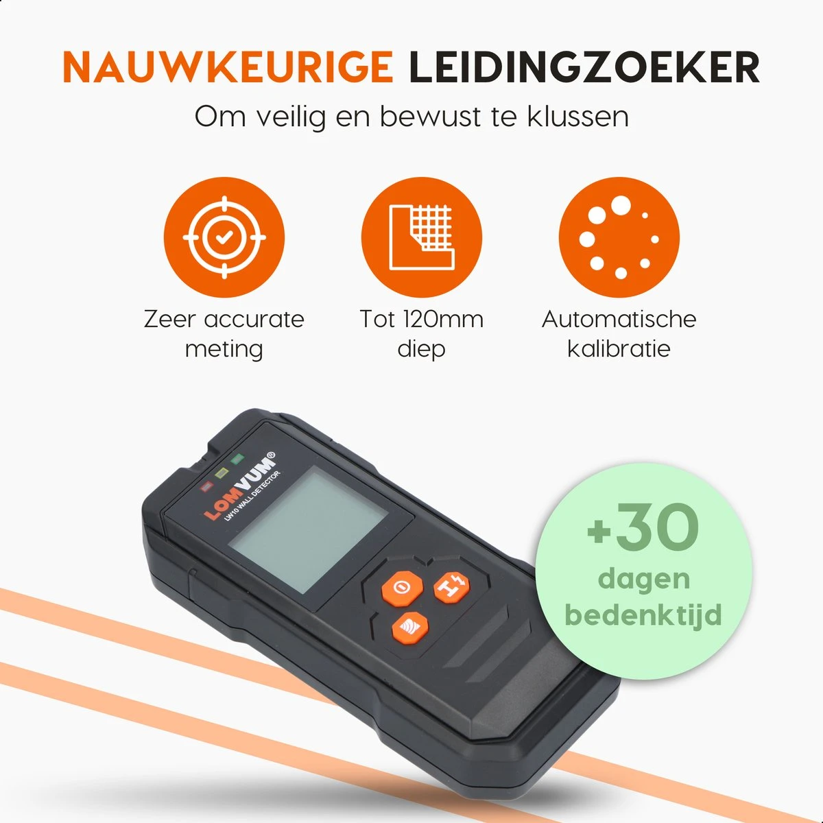 Door de Lomvum software heb je nooit kallibratieproblemen. Bij opstarten plaats je de leidingzoeker tegen een muur waar geen balken en metalen zitten en hou je het apparaat op de plek totdat het groene lampje gaat branden. Hiermee verzeker je veilig gebruik en garandeer je maximale betrouwbaarheid. Je kan hierna direct aan de slag met scannen.