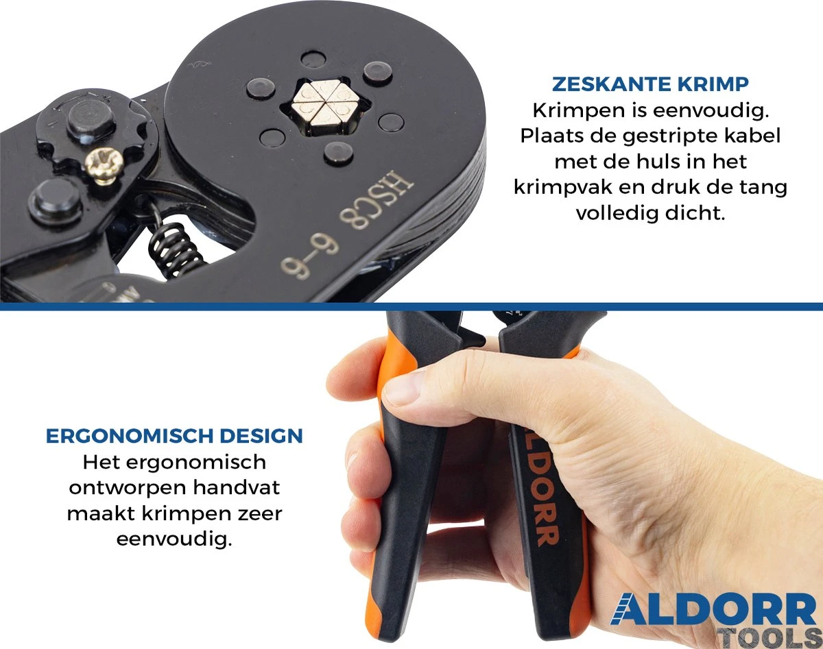 De ALDORR Adereindhulstang is een ideaal hulpmiddel voor het verbinden van draden en kabels. Met behulp van de adereindhulstang verbindt u de adereindhuls eenvoudig met de kabel. De kabel is vervolgens eenvoudig aan te sluiten. De tang maakt gebruik van zij-invoering en heeft een zeskante krimp. Het krimpbereik van de tang is 0,25 tot 6 mm2 (AWG 23-10) voor zowel geïsoleerde als niet-geïsoleerde aderhulzen. De adereindhulzen worden niet meegeleverd. Heeft u hier interesse in? Bekijk dan onze sets, waarbij de tang en adereindhulzen samen geleverd worden.