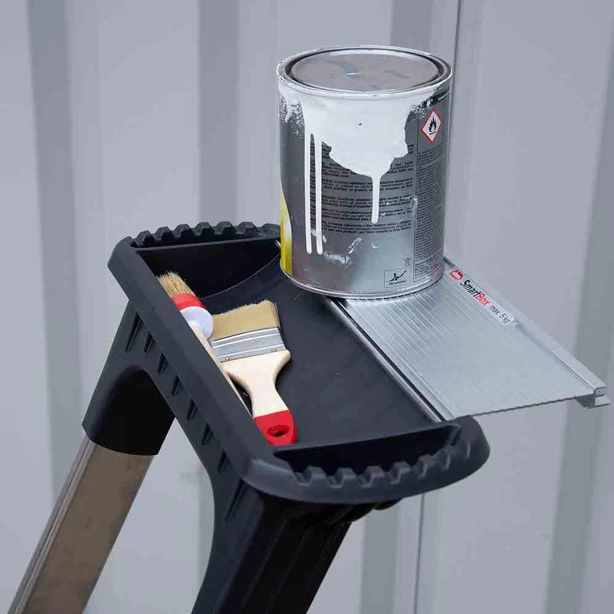De Double Decker heeft vele handige extra’s. Wat te denken van de SmartBox: een afsluitbaar component om klein materiaal in te leggen. En om gereedschap óp te leggen. Handig en veilig! De SmartBox is daarnaast ook nog eens voorzien van een emmerhaak. Erg praktisch wanneer je een emmer kwijt moet zodat je een handje extra vrij hebt. Inklappen van de trap doe je met de HandGrip. Hiermee is de trap gemakkelijk en veilig te borgen en te ontgrendelen.