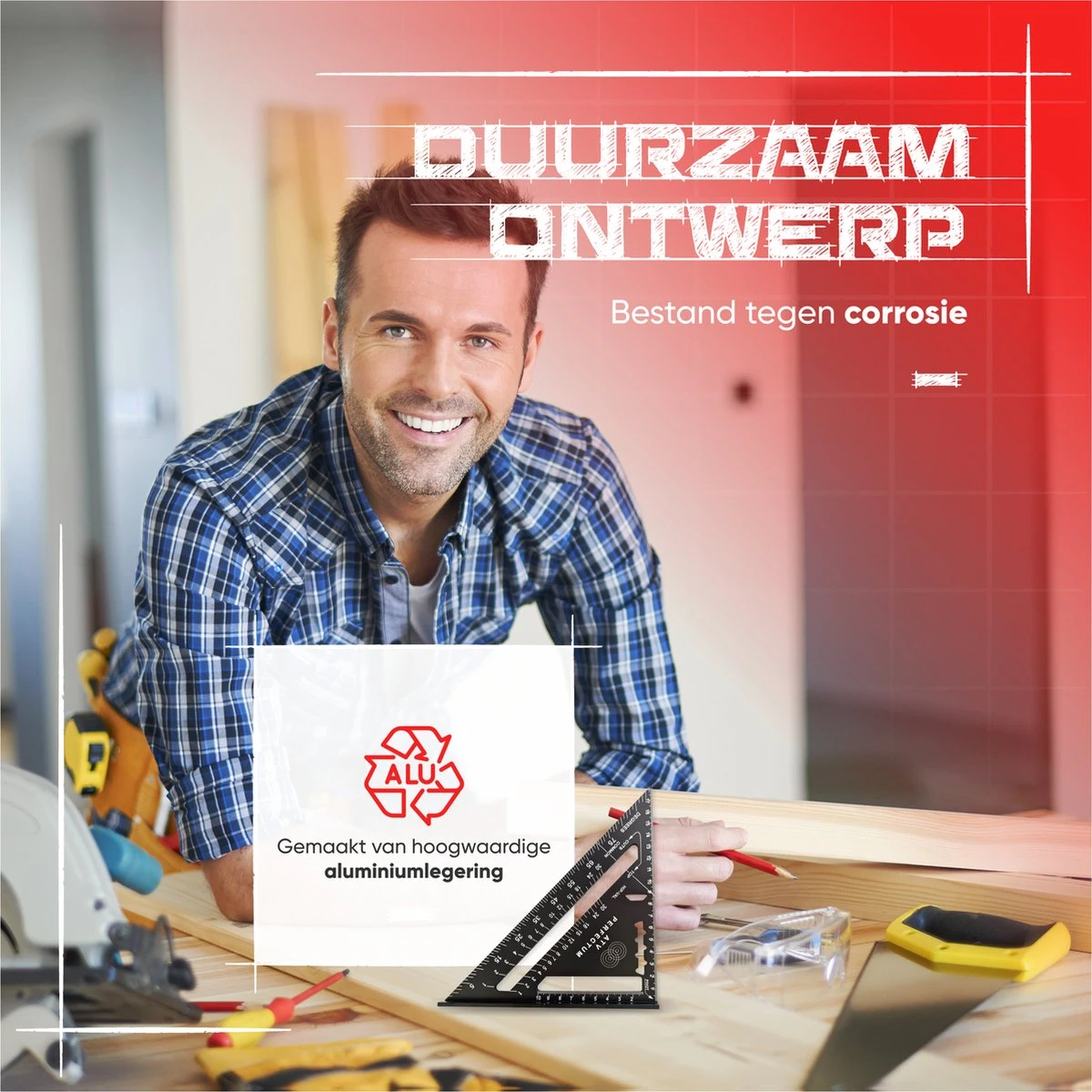 Gaat jarenlang mee – De winkelhaak is gemaakt van ijzersterk aluminium waardoor hij gemakkelijk jarenlang meegaat.