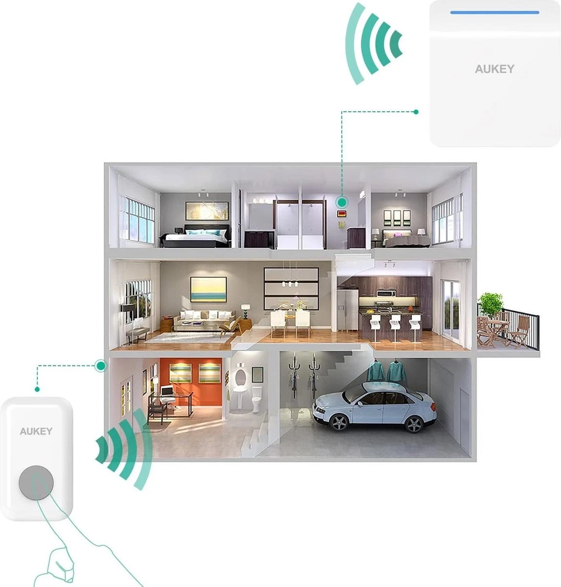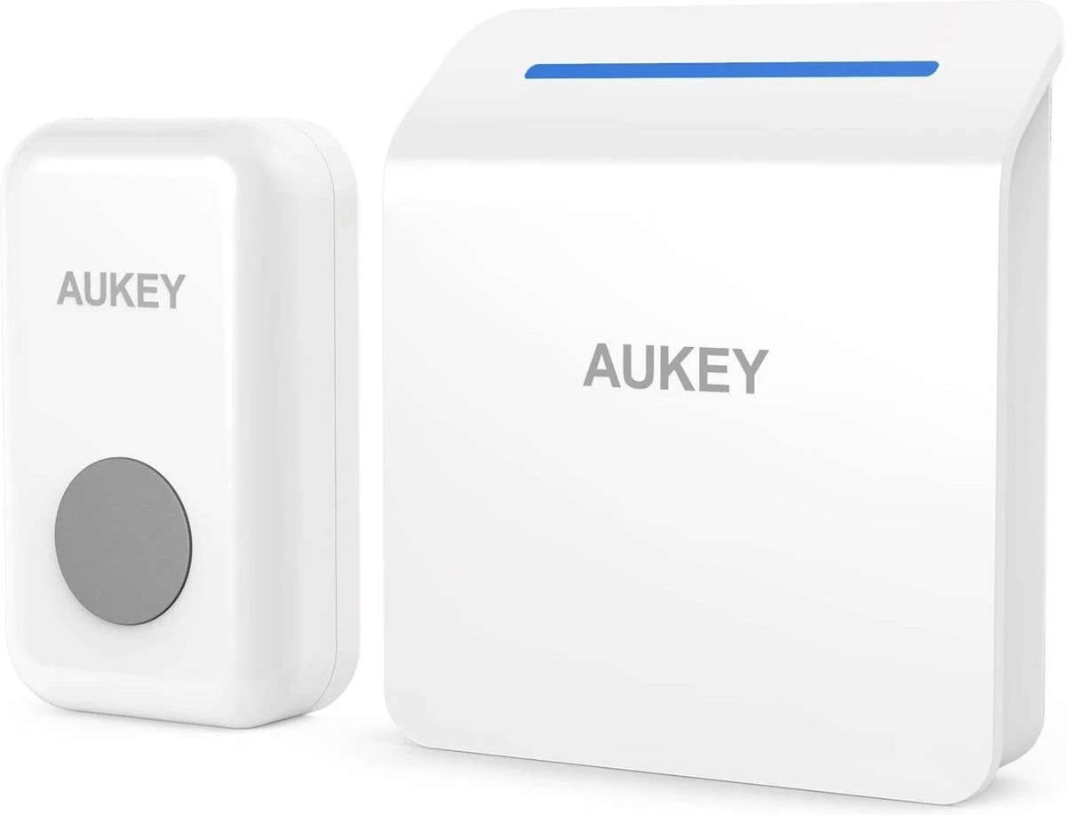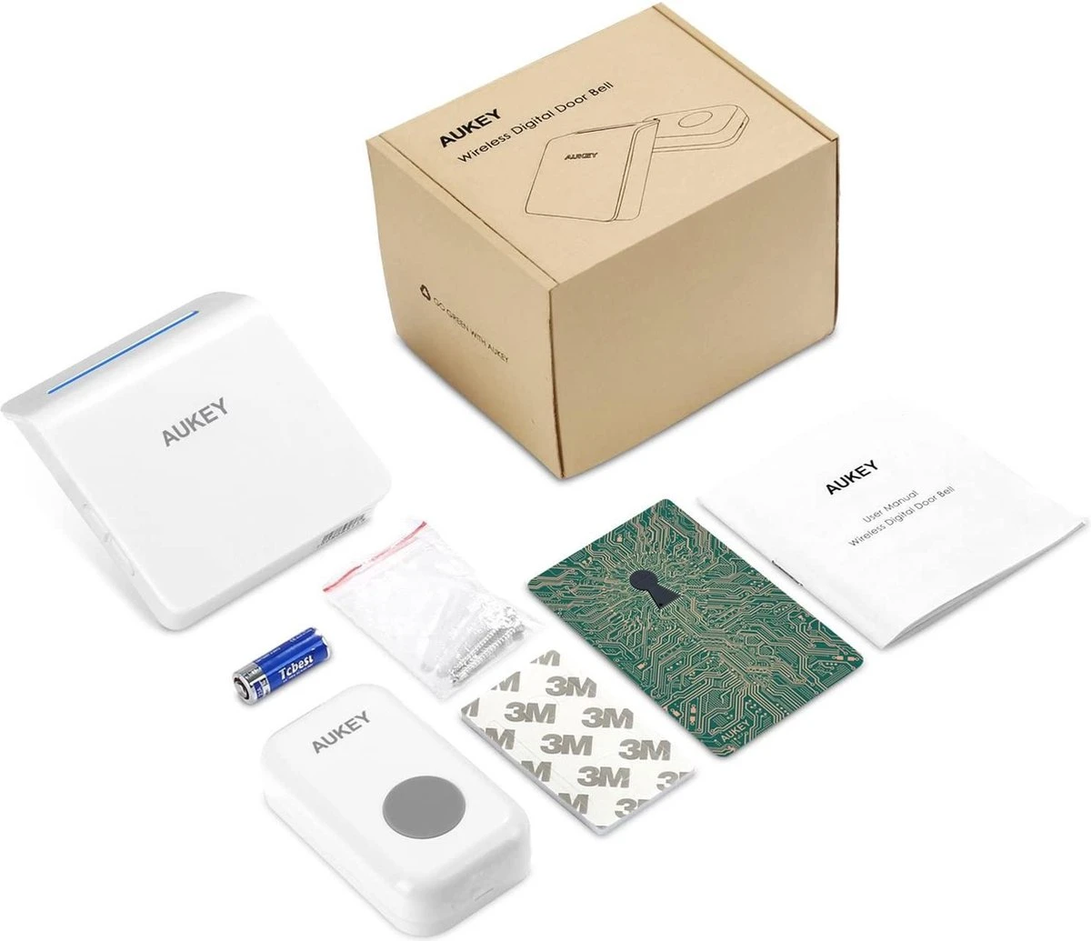 Verpakkingsinhoud: 1 draadloze deurbel – Aukey – ST-D1, zender en ontvanger, dubbelzijdige tape, stelschroeven en haken en 1 instructiehandleiding