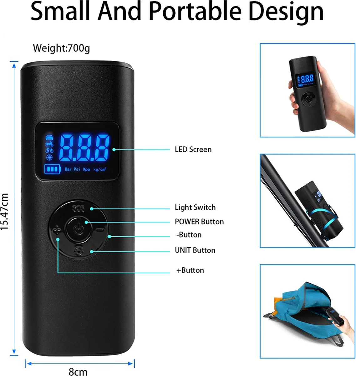 [Bandenspanningscontrole & 4 opblaasbare modi & LCD-scherm & automatische uitschakeling] De digitale bandenpomp heeft een groot digitaal LCD-scherm met 4 drukmeeteenheden – PSI, KPA, BAR, KG/CM². Realtime rapportage van nauwkeurige gegevens om de bandenspanning te kennen. U kunt de gewenste drukwaarde voor uw banden vooraf instellen en wanneer de vooraf ingestelde druk is bereikt, stopt de luchtcompressor automatisch met oppompen.