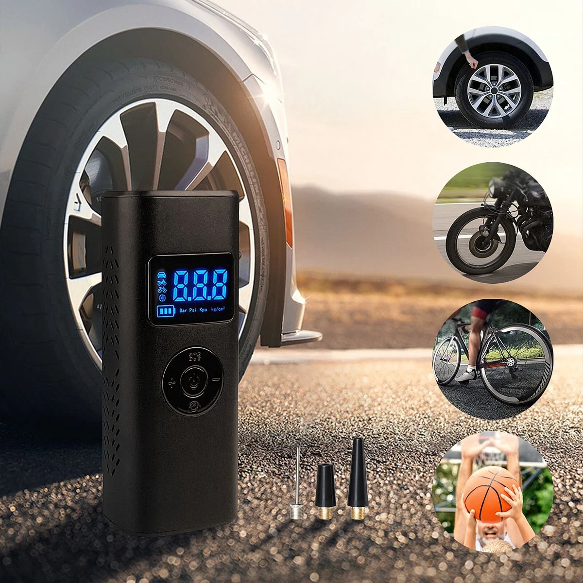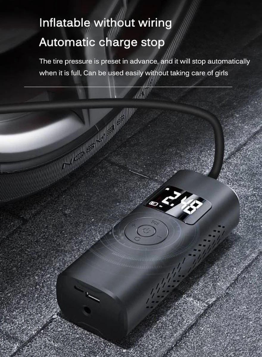 [Draadloze multifunctionele elektrische bandenpomp] Deze bandenpomp zorgt ervoor dat je je auto-, fiets-, motorbanden of andere opblaasbare voorwerpen gemakkelijk binnen enkele minuten kunt oppompen. Door het draadloze ontwerp ben je helemaal af van de rommelige snoeren. Blaas overal en altijd op voor meer draagbaarheid en gebruik buitenshuis.