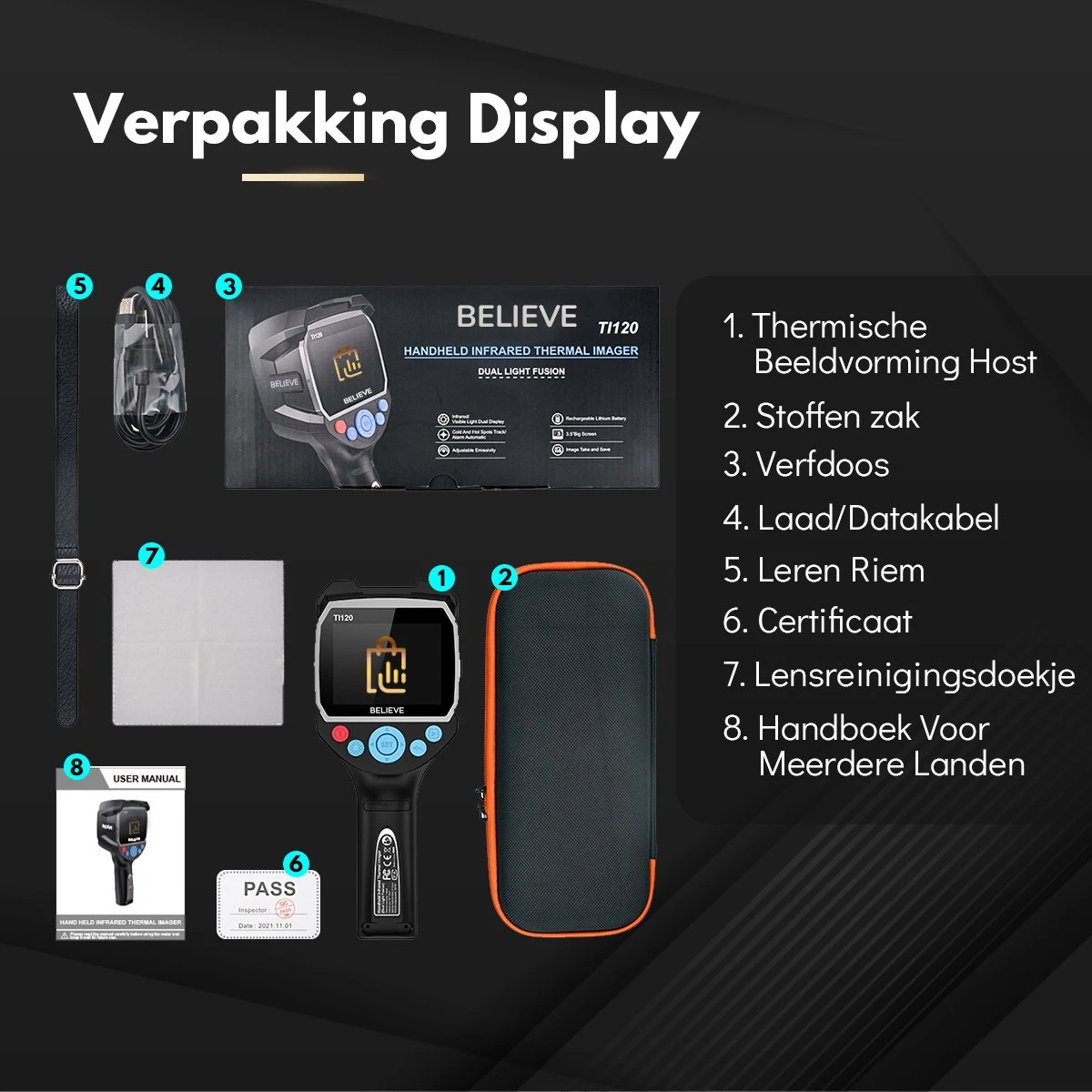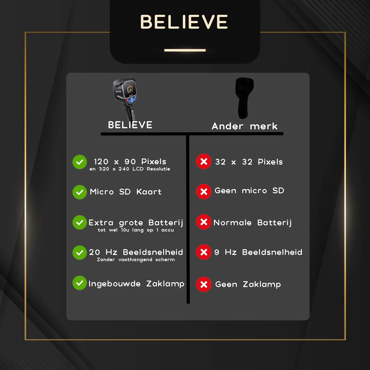 Met alle specifieke functies, zoals de zaklamp en het grote scherm en micro SD kaart, is de warmtebeeldcamera van BELIEVE een must-have voor degenen die op zoek zijn naar nauwkeurige resultaten een gebruiksvriendelijk apparaat en op zoek zijn naar een efficiente investering.