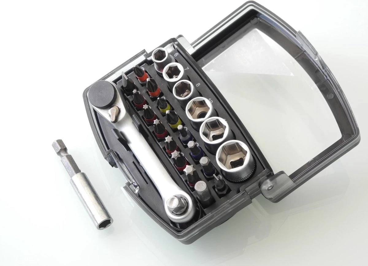 Uitgebreide doppen set die in een handige opberg box wordt geleverd. Een speciaal kenmerk van het ratel zijn de twee kanten. De ene kant is voorzien voor de ontvangst van bithouder of bits. De andere zijn voorzien van een vierkant adapter.