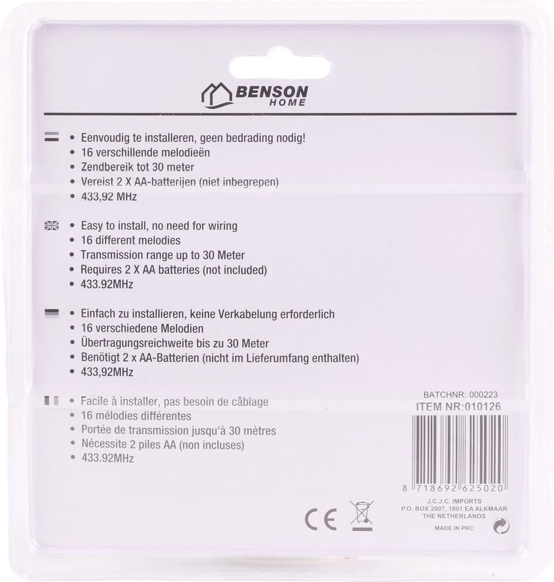 Jij zoekt een deurbel die praktisch en stijlvol is? Dan is de Benson Deurbel Compact iets voor jou! Deze deurbel is draadloos en eenvoudig te installeren, zonder enige bedrading nodig. Bovendien heeft deze deurbel een zendbereik van maar liefst 30 meter en 16 verschillende melodieën, zodat je altijd op een unieke manier gewaarschuwd wordt wanneer er iemand aan de deur is.