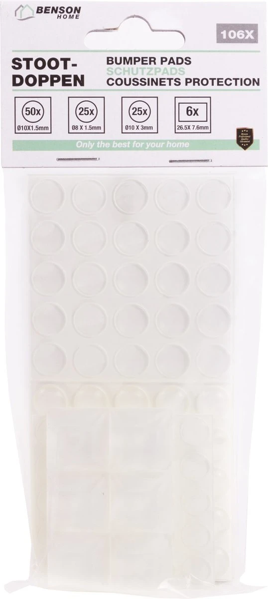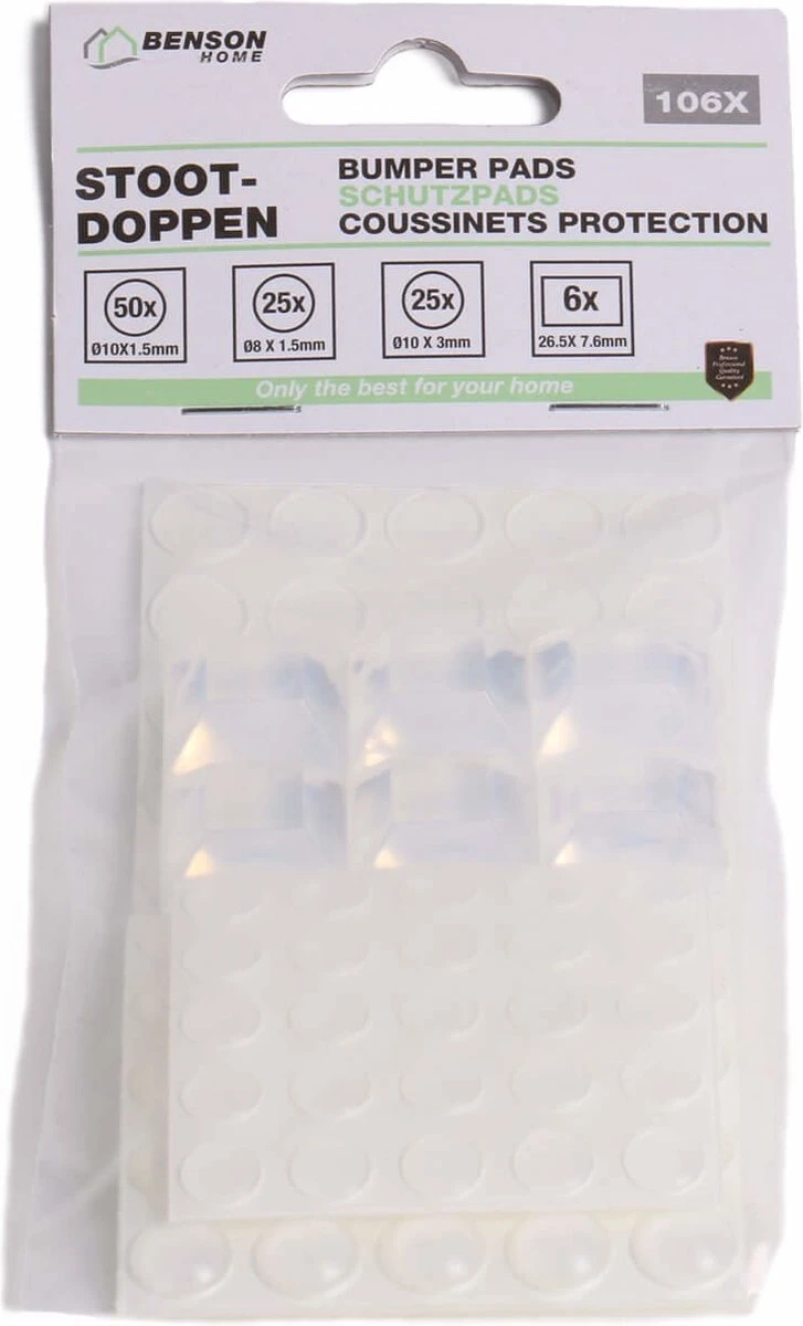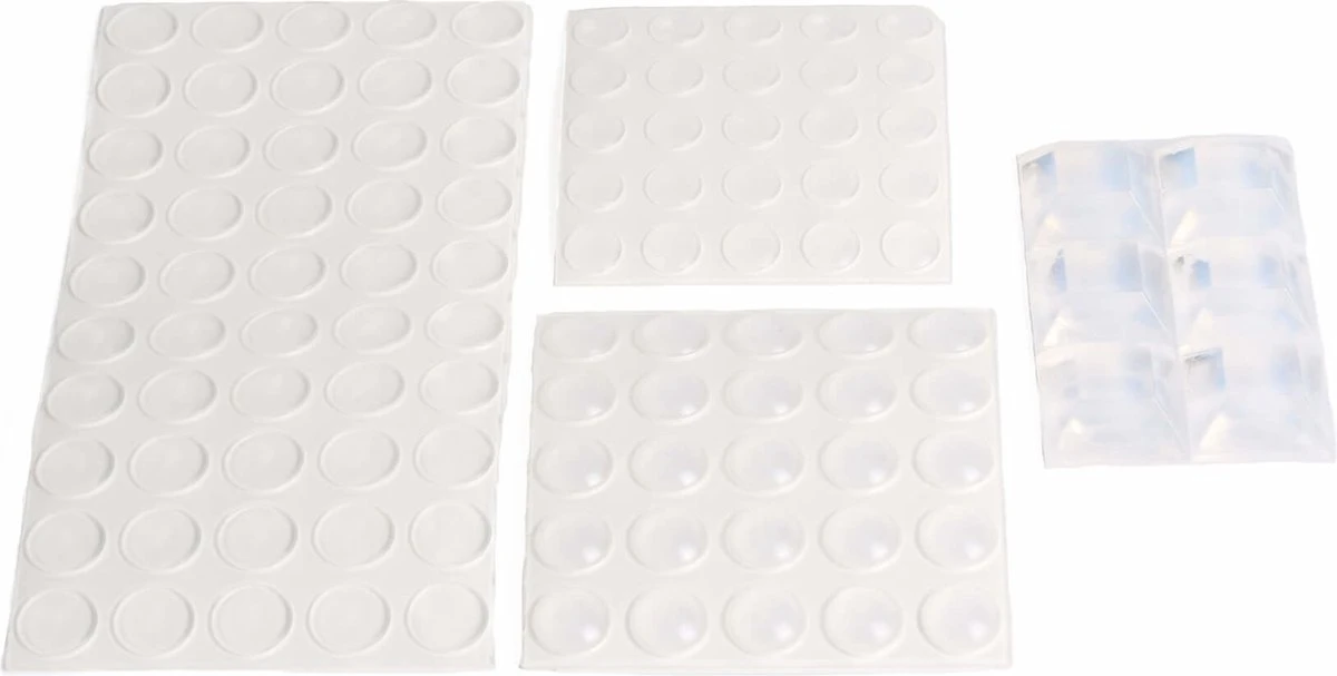 Met deze stootdoppenset voorkom je beschadigingen. 50 stuks van 10 mm x 1,5mm, 25 stuks van 8 mm x 1,5mm, 25 stuks van 10mm x 3mm, 6 stuks van 20,6 mm x 7,6mm. Specificaties Beoogd gebruik Meubels Hoeveelheid 1 set Kleur Transparant Ankermateriaal Plastic