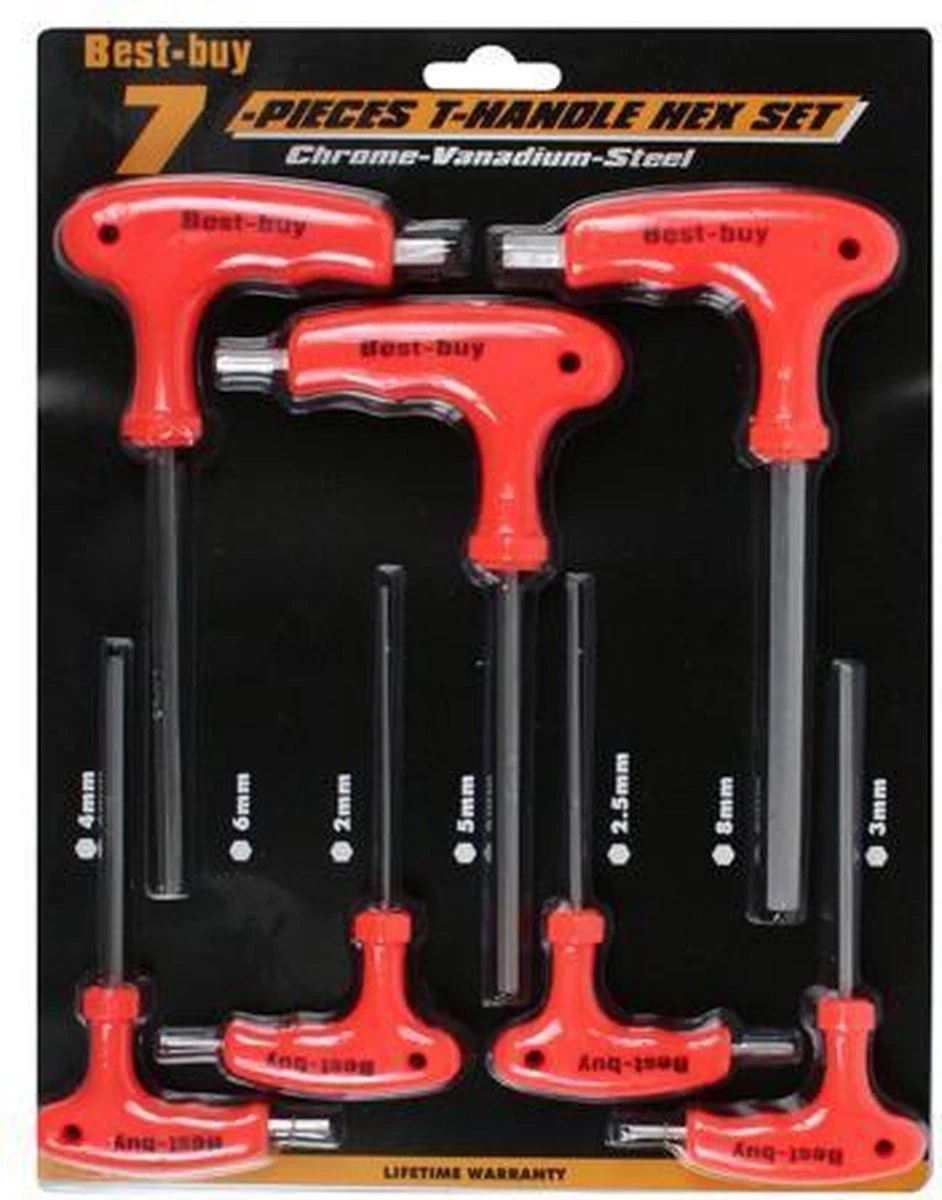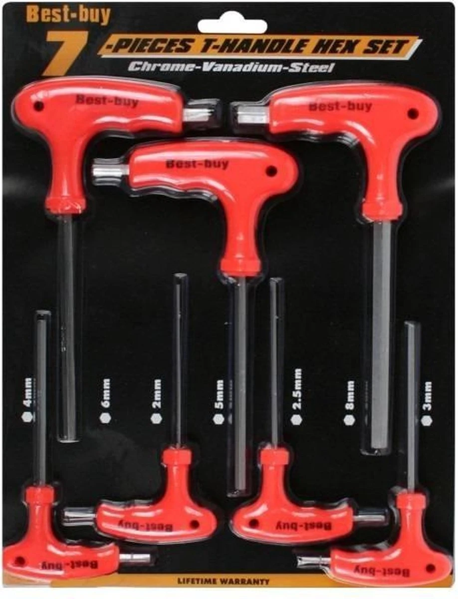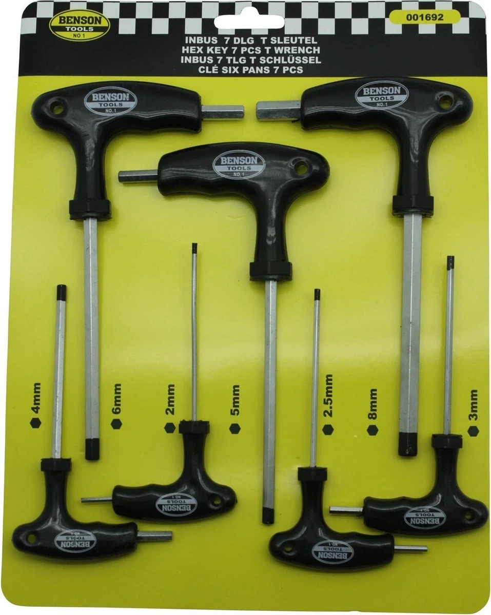Deze inbussleutels set is een verzameling van 7 veel voorkomende binnenzeskant stiftsleutels, namelijk de formaten: 2 mm, 2.5 mm, 3 mm, 4 mm, 5 mm, 6 mm eb 8 mm dit zijn bovendien de veel voorkomende inbussleutels waardoor je dus in een keer bent voorzien van een vrij volledige inbussleutel collectie.