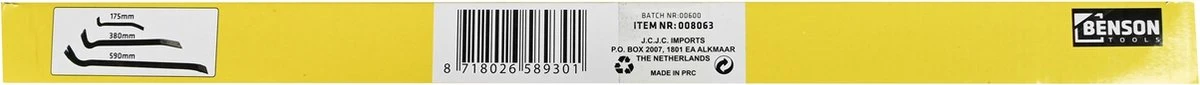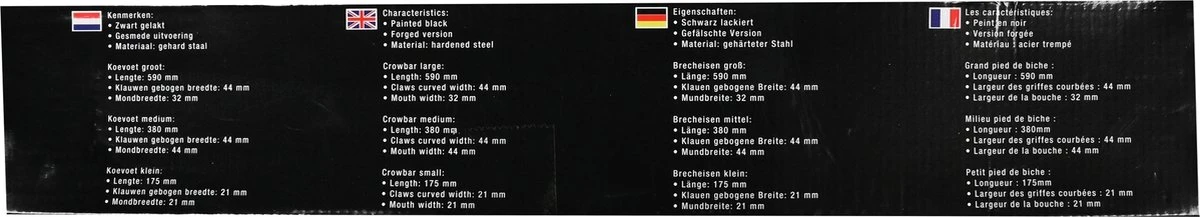 De koevoet of breekijzer is een op een hefboom gebaseerd hulpmiddel dat wordt gebruikt om dingen te openen. Hierdoor kun je eenvoudig twee delen van elkaar scheiden of een opening creëren. De koevoet set word 3 delig in het zwart verkocht en is gemaakt van staal. De klauwen van de koevoeten zijn allemaal gebogen en de lengte van elke koevoet is: 590 mm, 380 mm en 175 mm.