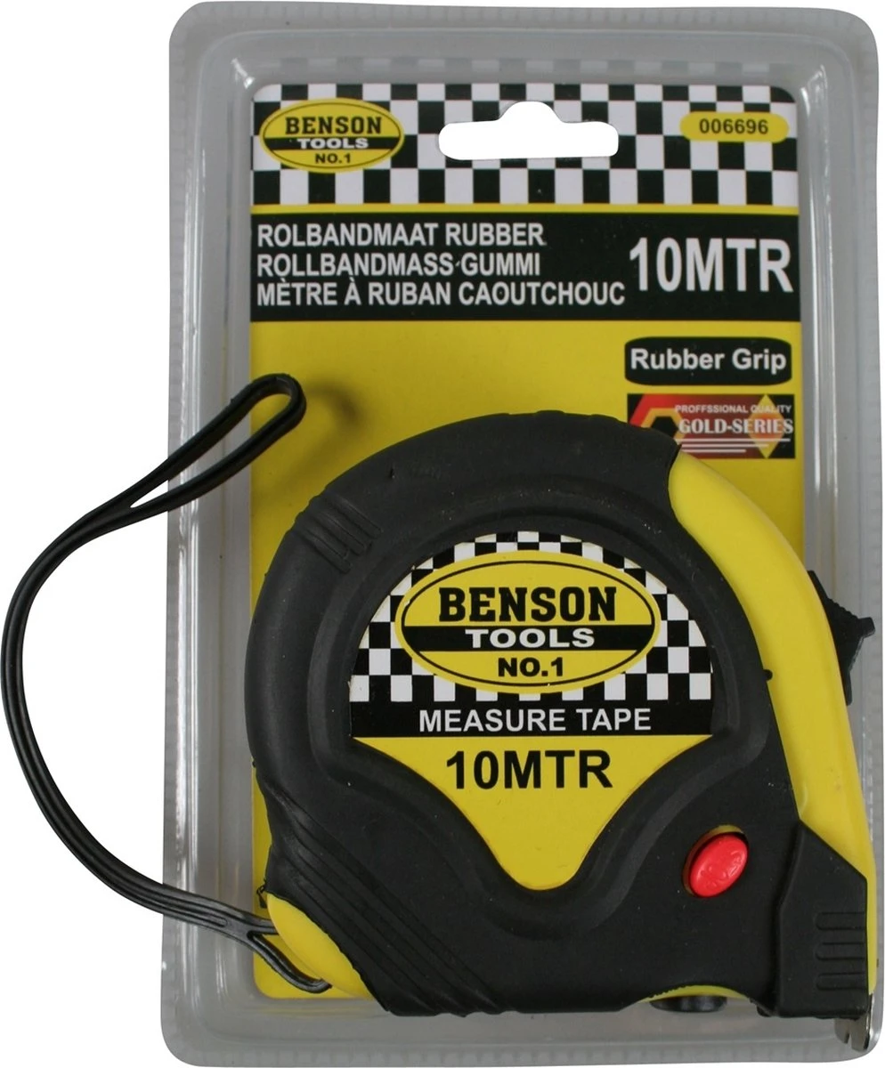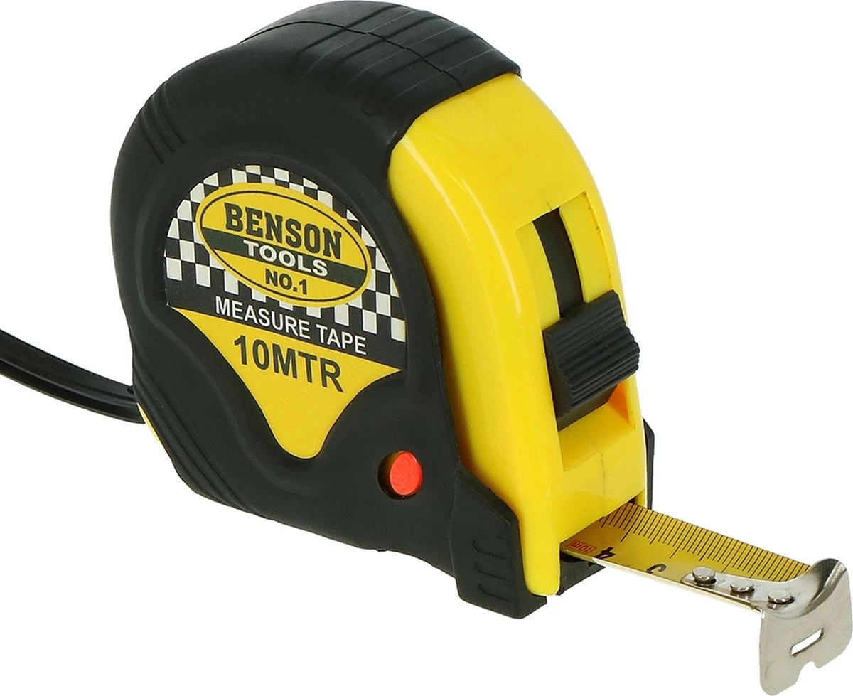 Rolmaat meetlint, 10 meter. Deze rolmaat is voorzien van een broekklem, waardoor men nooit misgrijpt. De rolbandmaat is 1000 cm bij 25 mm. Materiaal: rubber en kunststof.