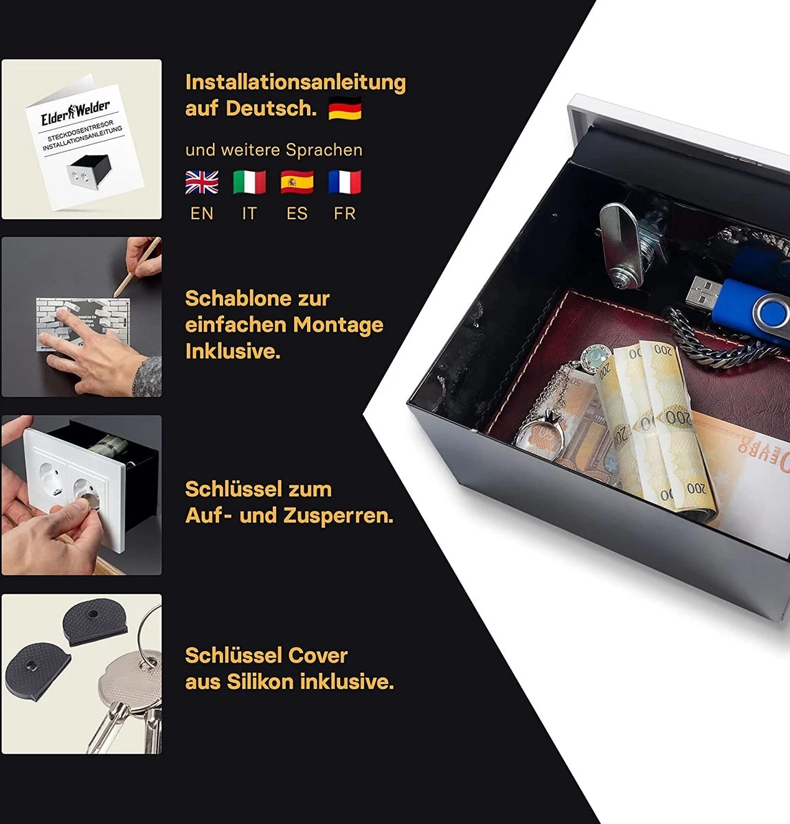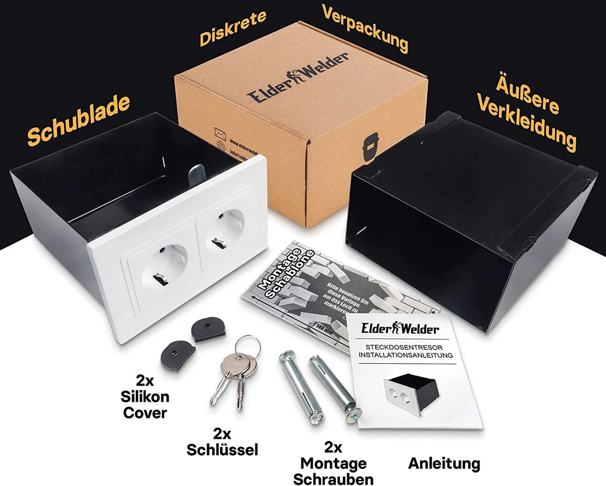 | Verpakkingsinhoud | Elder Welder® Veilig voor stopcontacten, klein, discreet, wandkoffer, sterk, geheime contactdoos voor het opbergen van geld, geheime verstopplaats in zilver, huis, met sleutel, geheime koffer |