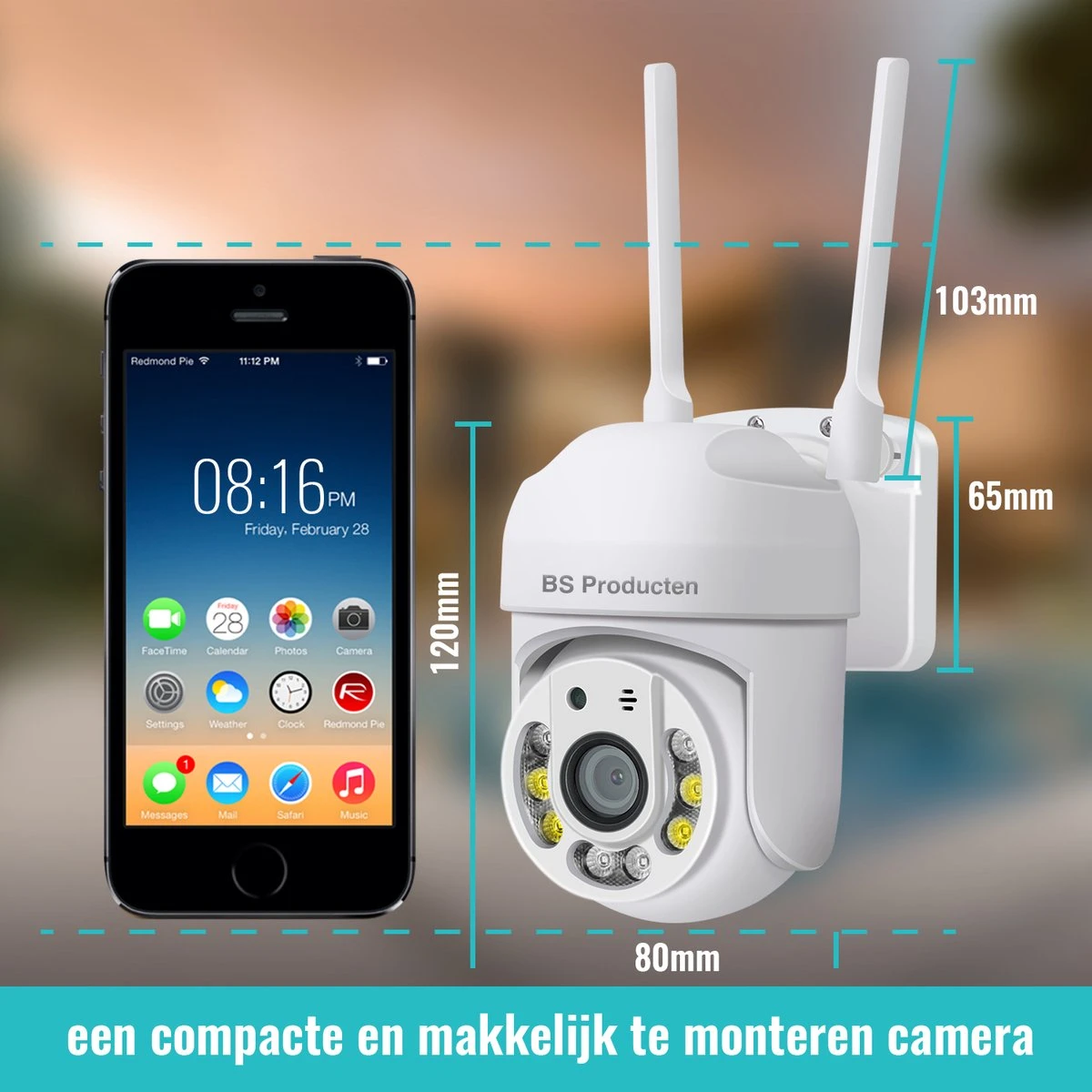 De camera is binnen mum van tijd aangesloten op het netwerk en klaar voor gebruik. De camera dient op 2 plekken bevestigd te worden. Hiervoor wordt een setje schroeven en pluggen meegeleverd. Bovendien is de app zeer gebruiksvriendelijk , zodat je direct aan de slag kan. De camera draait op dezelfde app als de binnencamera van BS Producten.