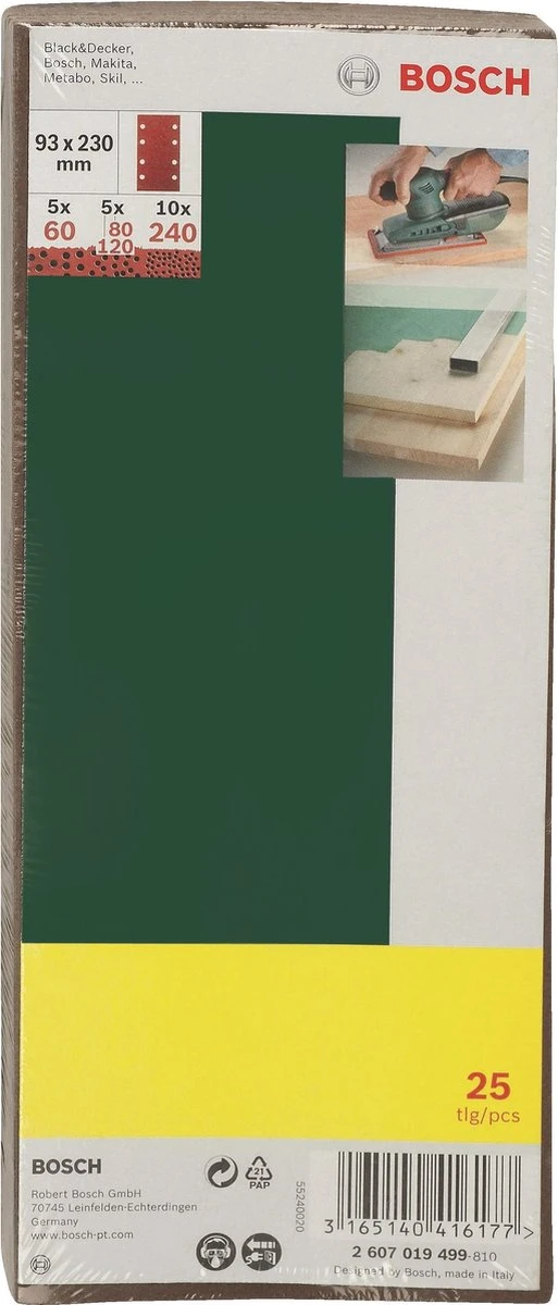 Duurzame schuurbladen voor alle schuurwerkzaamheden, van het verwijderen van dunne verflagen tot het fijnschuren vóór het lakken (korrelgrootte 60 – grof, korrelgrootte 80 – middelgrof, korrelgrootte 120 – fijn, korrelgrootte 240 – extra fijn). Ideaal voor een gelijkmatige schuurresultaat op grotere, egale oppervlakken. De juiste korrelgroottes voor alle toepassingen en werkstappen. Krachtige, nauwkeurig passende schuurbladen voor spanbeugelbevestiging in het formaat 93 x 230 mm. 8 afzuiggaten voor stofafzuiging.