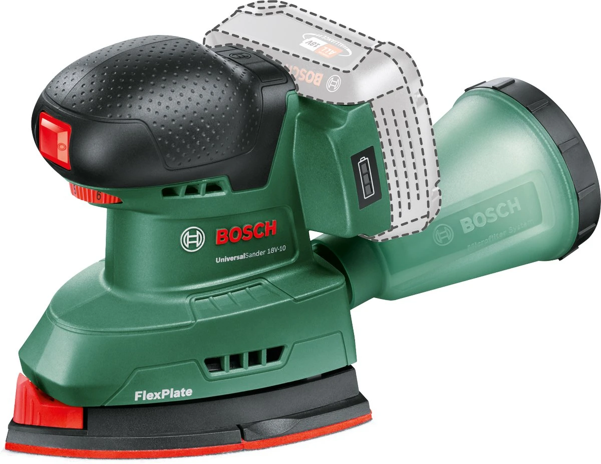 De UniversalSander 18V-10 is universeel inzetbaar en geschikt voor het schuren van hout, kunststoffen en metaal. De strijkijzervorm en de mogelijkheid om via een SDS-systeem verschillende schuuropzetstukken zoals een schuurtong of een lamellenvoorzetstuk te bevestigen, maken de machine veelzijdig inzetbaar. Het schuurplateau bestaat uit twee deelvlakken. Voor de optimale benutting van het schuurpapier kan de deltapunt van het schuurpapier en het schuurplateau moeiteloos losgemaakt en gedraaid worden. De schuurbladen worden met behulp van een microklithechting bevestigd, die zelfs na intensief gebruik nog zeer goede hechteigenschappen heeft.
