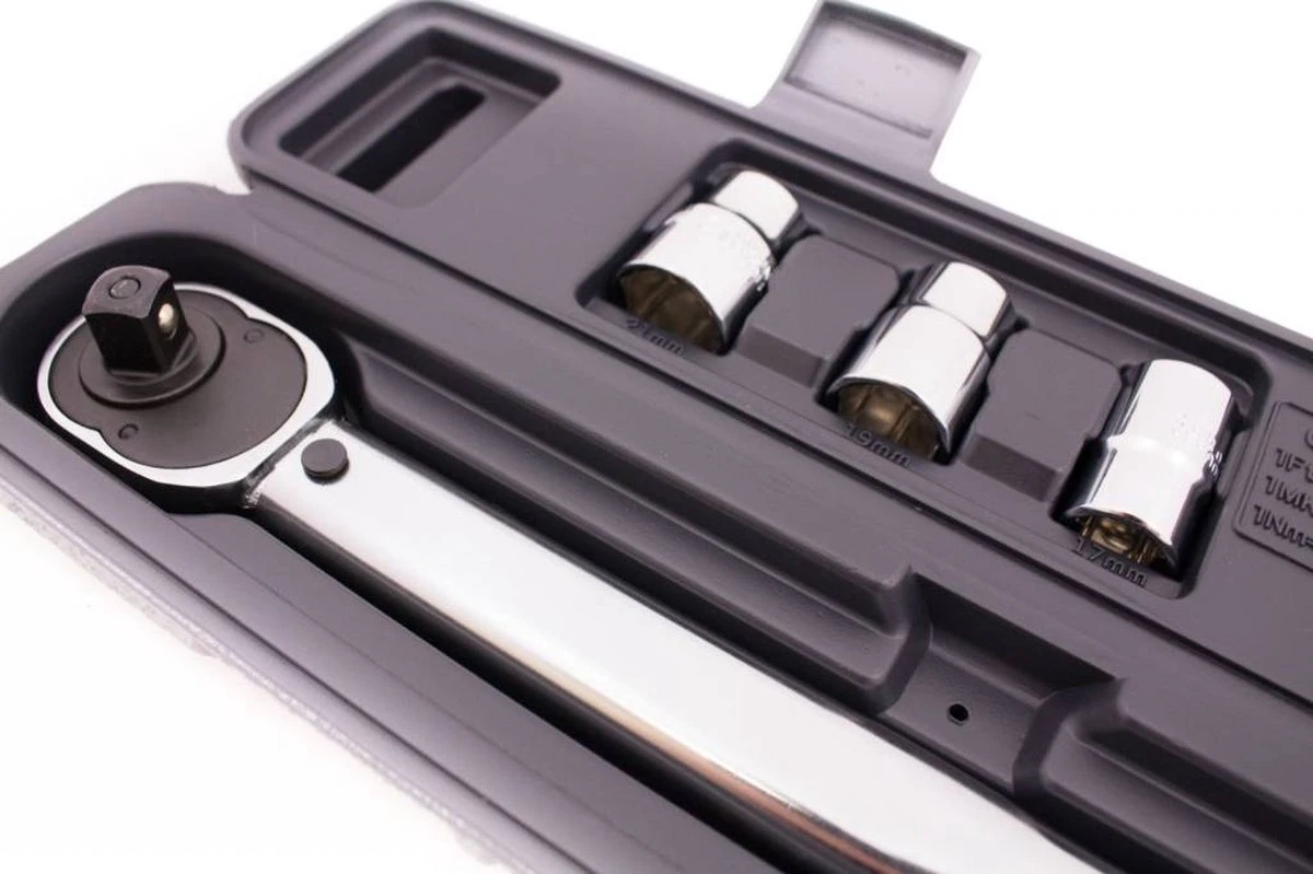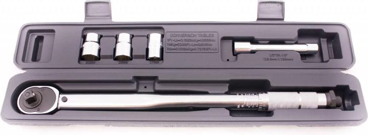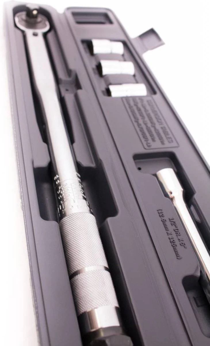 Kleur: zilver Materiaal: metaal Afmetingen: 45 x 5 x 3 cm (L x B x H) Omkeerbare ratel Aandrijfvierkant: 1/2″ Bereik: 40-210 Nm Wordt geleverd in een kunststof opbergkoffer Levering bevat : 1 x 125 mm verlengstaaf 3 x dop (17, 19 en 21 mm) 1 x momentsleutel