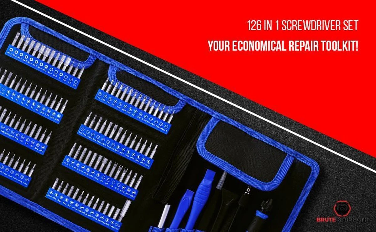 Alles wat je nodig heb in 1 volledige set! Deze 126-delige precisie schroevendraaier set van het merk Brute Strength ® is perfect voor bijvoorbeeld het repareren van smartphones én gameconsoles. Ook de reparatie en demontage van huishoudelijke apparaten zoals tv’s, laptops, camera’s, airconditioners, ventilatoren en koelkasten zijn een fluitje van een cent met deze set!