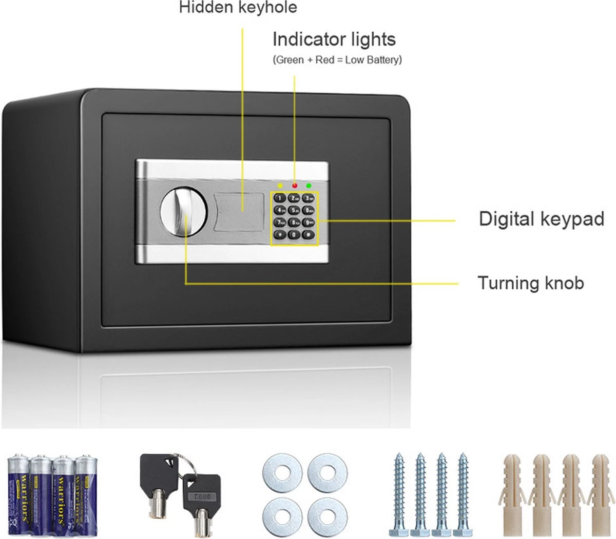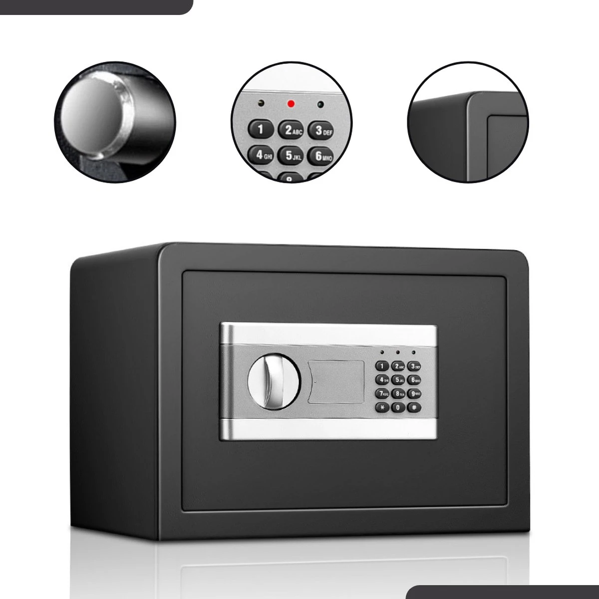 Het digitale codeslot van de kluis is batterij aangedreven waardoor je geen rekening hoeft te houden met het aansluiten op het lichtnetwerk. Als de batterijen op raken gaan het indicator lichtje rood branden. Daarnaast zijn er 2 sleutels aanwezig voor het geval de code wordt vergeten of de batterijen te weinig stroom levert. De kluis heeft een bescheiden simpele look, valt niet op en sluit aan op velen soorten interieur door de neutrale zwarte kleur.