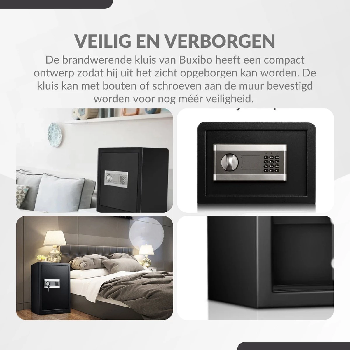 De kluis is zeer makkelijk te bevestigen door middel van de meegeleverde schroeven en pluggen. Monteer de kluis op een door uw gekozen, discrete plek. Voorzie de kluis van batterijen, stel de code in en geniet van deze veilige en stevige brandwerende kluis van Buxibo.