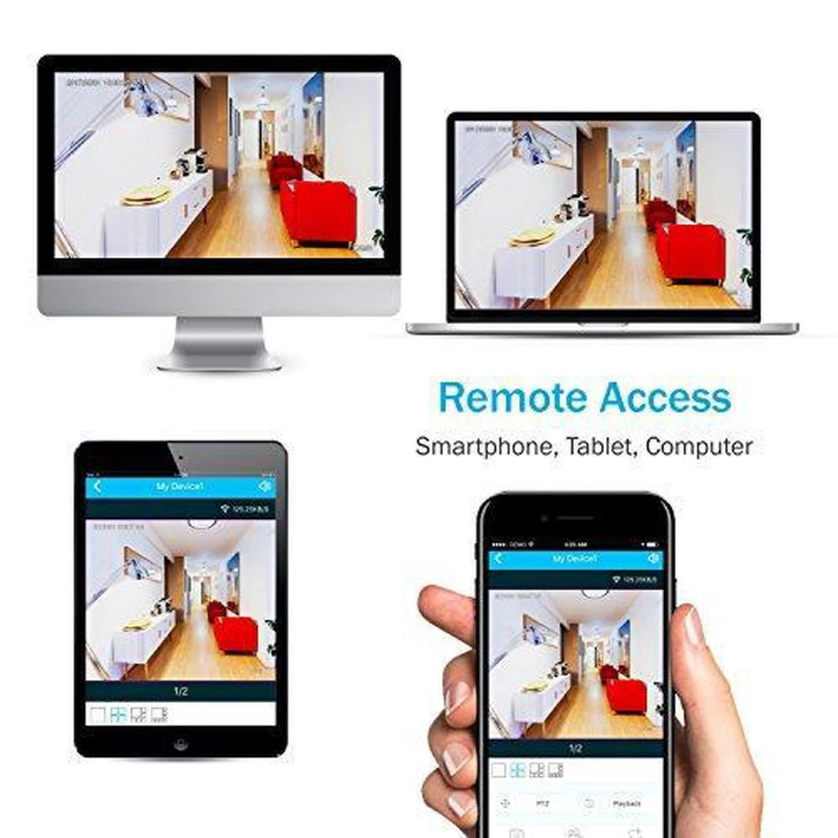 Beveilig uw pand en houd uw bezittingen in het oog, waar u ook bent. Als een van de vier camera’s een beweging detecteert, ontvangt u een notificatie en kunt u de beelden op uw smartphone of op het internet bekijken. De beveiliging set is voorzien van de nieuwste videocompressie resolutie en heeft een gebruiksvriendelijke grafische interface die grafische pictogrammen en visuele indicatoren biedt voor besturing en configuratie van de DVR.