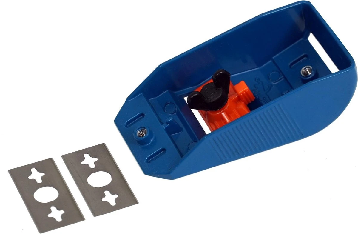 Metaal, met 2-zijdig snijdend beitelmesje. Geschikt voor vlak-, bol-, en holschaven, steken en krabben. Voor bewerken van hout, board, plastic, leer, rubber etc.