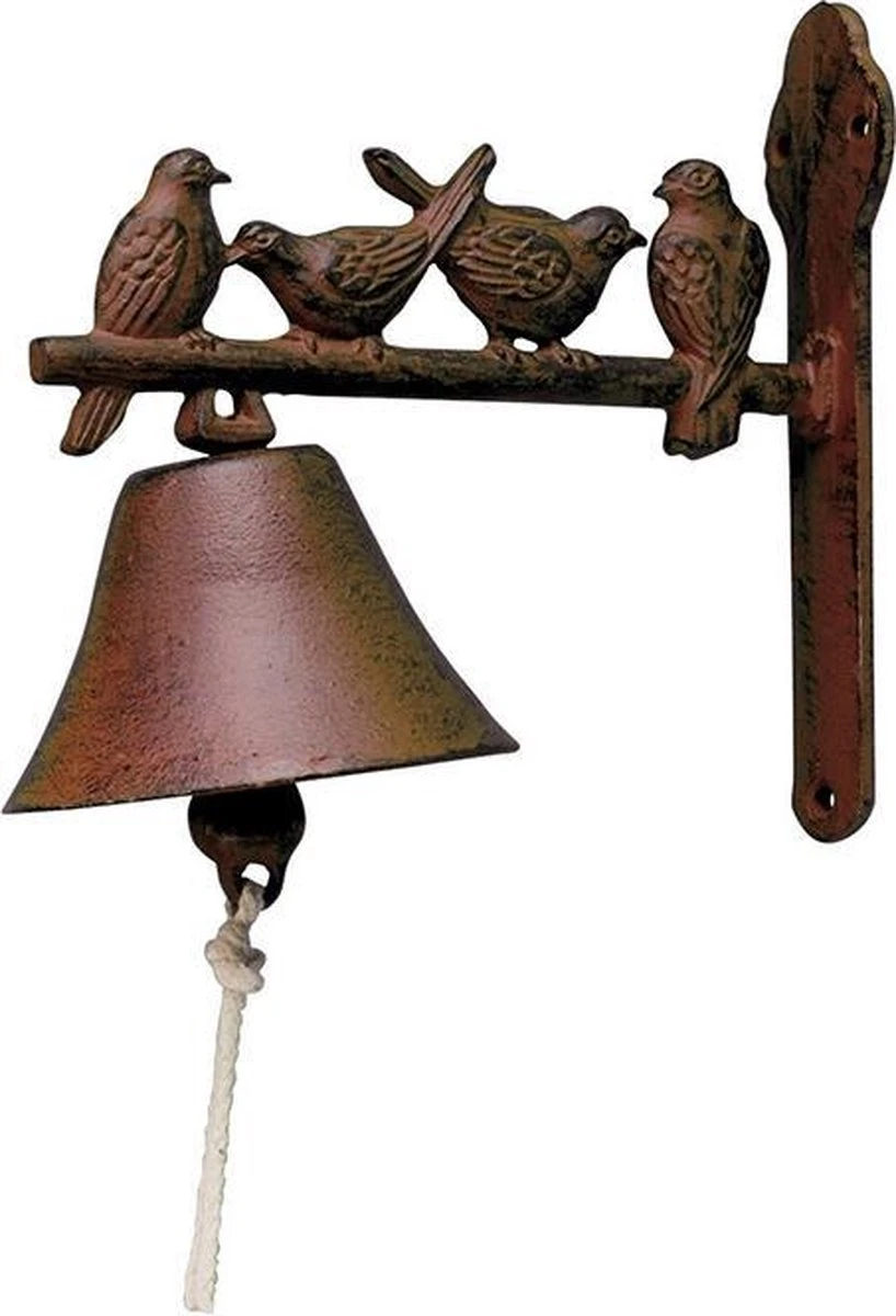 Antiek roestbruine gietijzeren deurbel met 4 vrolijke vogels op een rij.