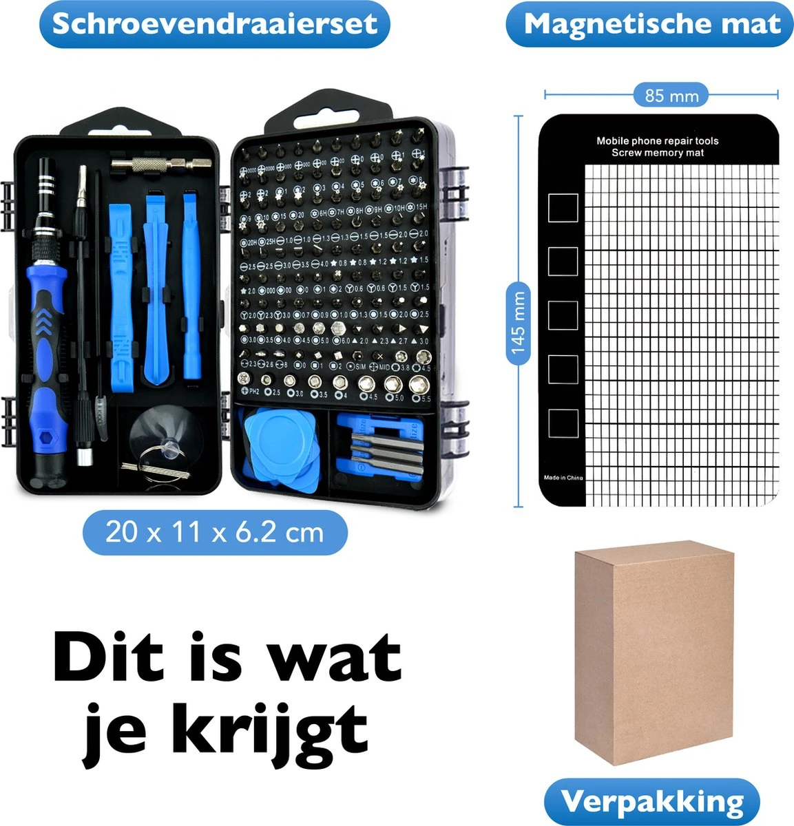 De draagbare schroevendraaierset bevat naast de kleine schroevendraaier met precisie bits ook andere noodzakelijke schroevendraaier accessoires en wordt geleverd met een magnetisch schroef- geheugen-matje voor gemakkelijk en doeltreffend demonteren en hermonteren van schroeven. Dit alles in een goed ontworpen en handzame bewaardoos.