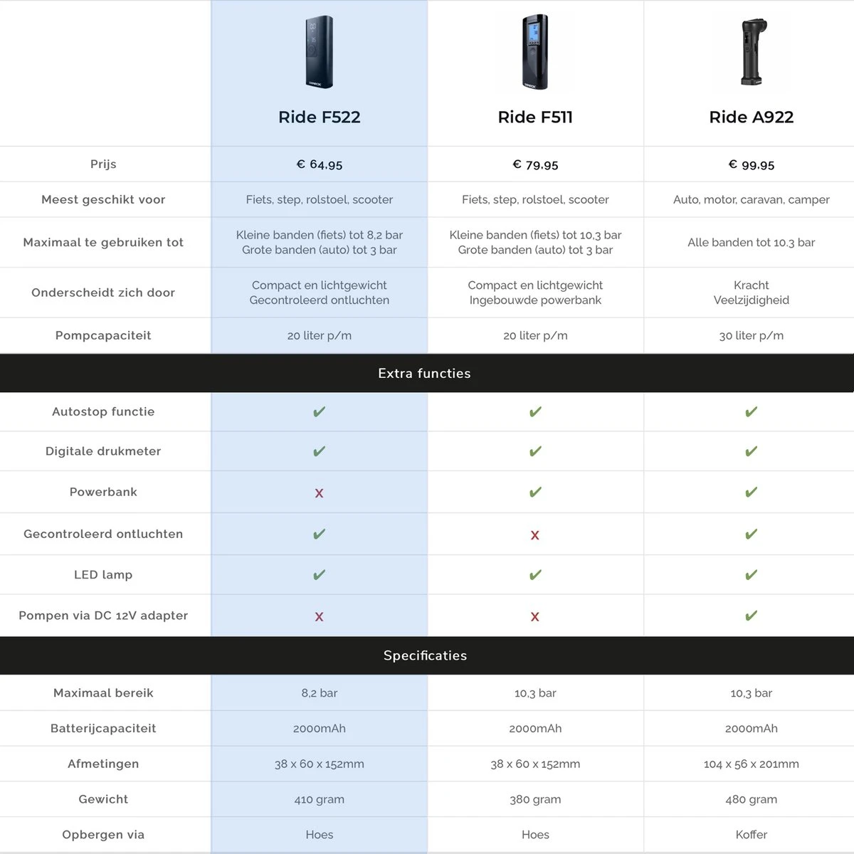 De Ride F522 heeft een pompcapaciteit van 20 liter per minuut en een accu van 2000mAh. Daarmee is de Ride F522 ontworpen voor het oppompen van banden van een fiets, rollator, step, scootmobiel of vergelijkbare banden tot 8,2 bar. Verder is deze pomp compact en licht en daarmee uitermate geschikt om mee te nemen tijdens een fietstocht.
