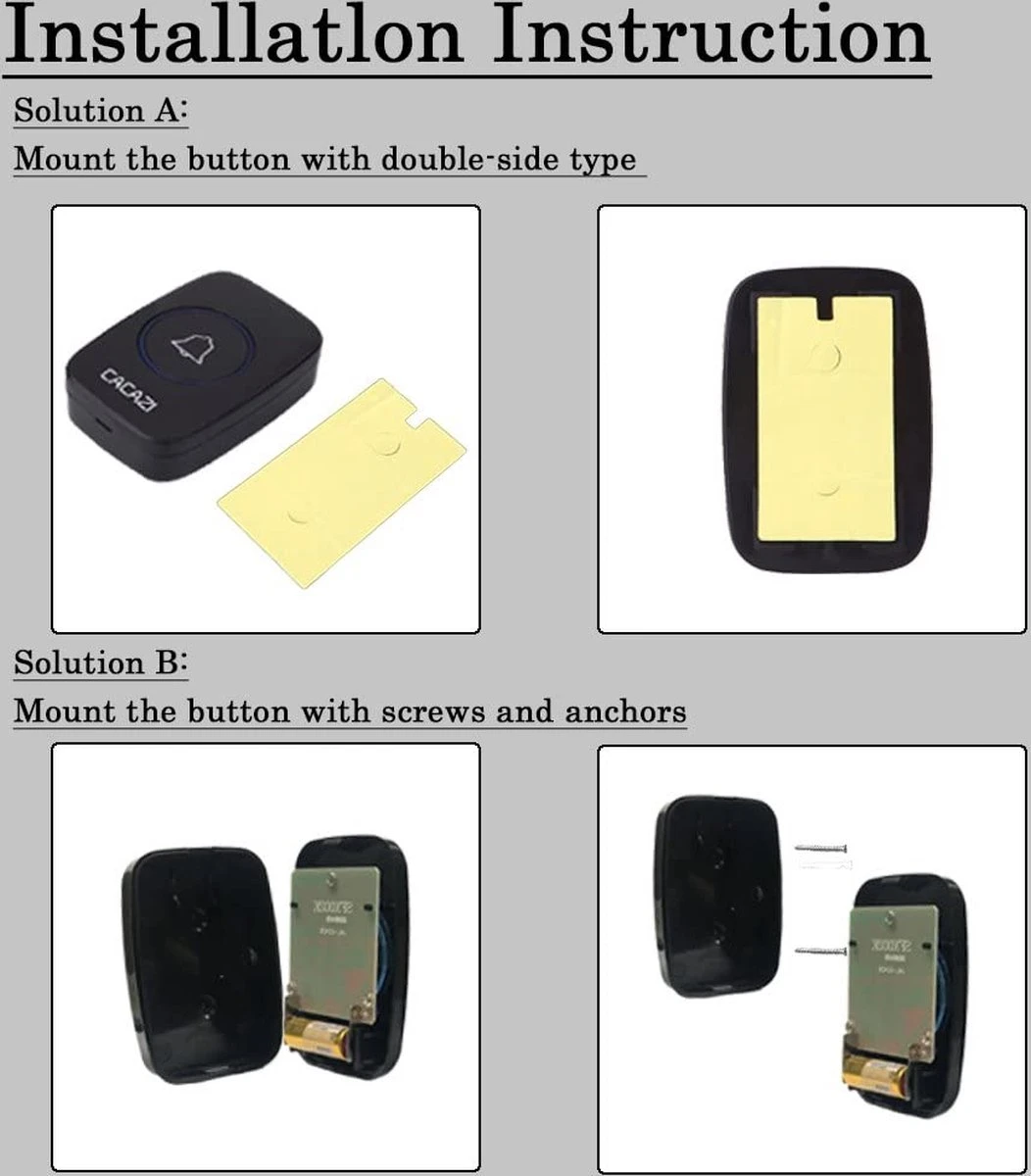 Eenvoudige installatie: sluit de ontvanger gewoon aan op een stopcontact, installeer de drukknop met de meegeleverde dubbelzijdige tape of schroef hem aan de muur (schroeven zijn inbegrepen).