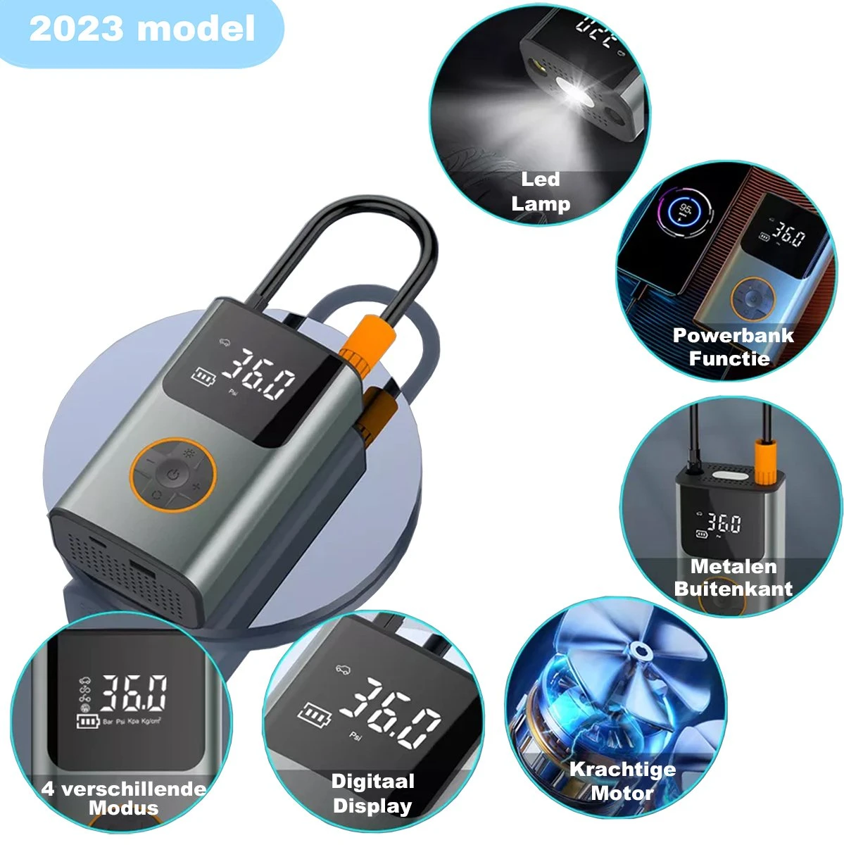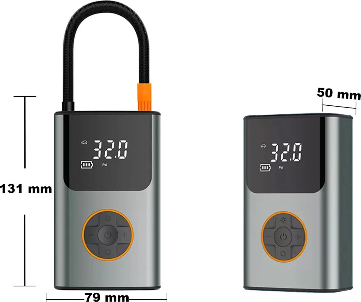 Met deze krachtige en veelzijdige 6-in- draagbare compressor heb jij altijd en overal een multifunctionele USB oplaadbare luchtcompressor bij de hand. Deze elektrische bandenpomp met digitale bandenspanningsmeter, zaklamp en powerbank functie is ideaal om banden van je fiets, auto of ander voertuig op spanning te brengen voor vertrek en onderweg. Daarnaast kan de compressor ook dienen als luchtbeddenpomp en wordt geleverd met 7 opzet stukken en een reistas voor extra gebruiksgemak. Bestel nu jou 6-in-1 draagbare compressor bandenpomp!