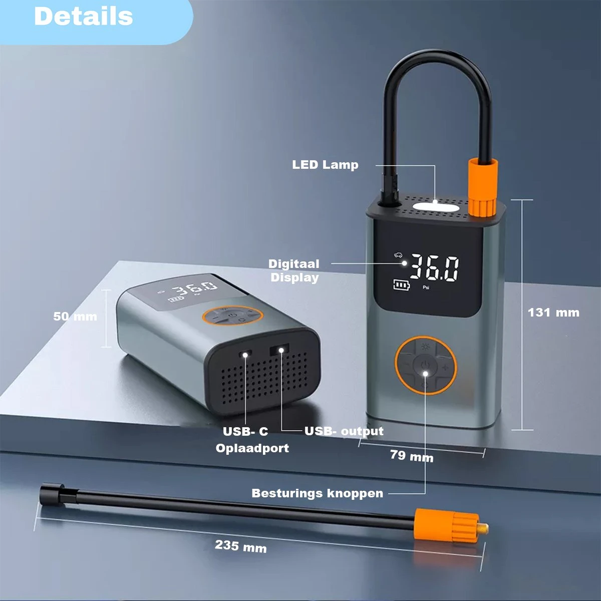 - Inclusief diverse ventielen, USB oplaadkabel en gebruiksaanwijzing