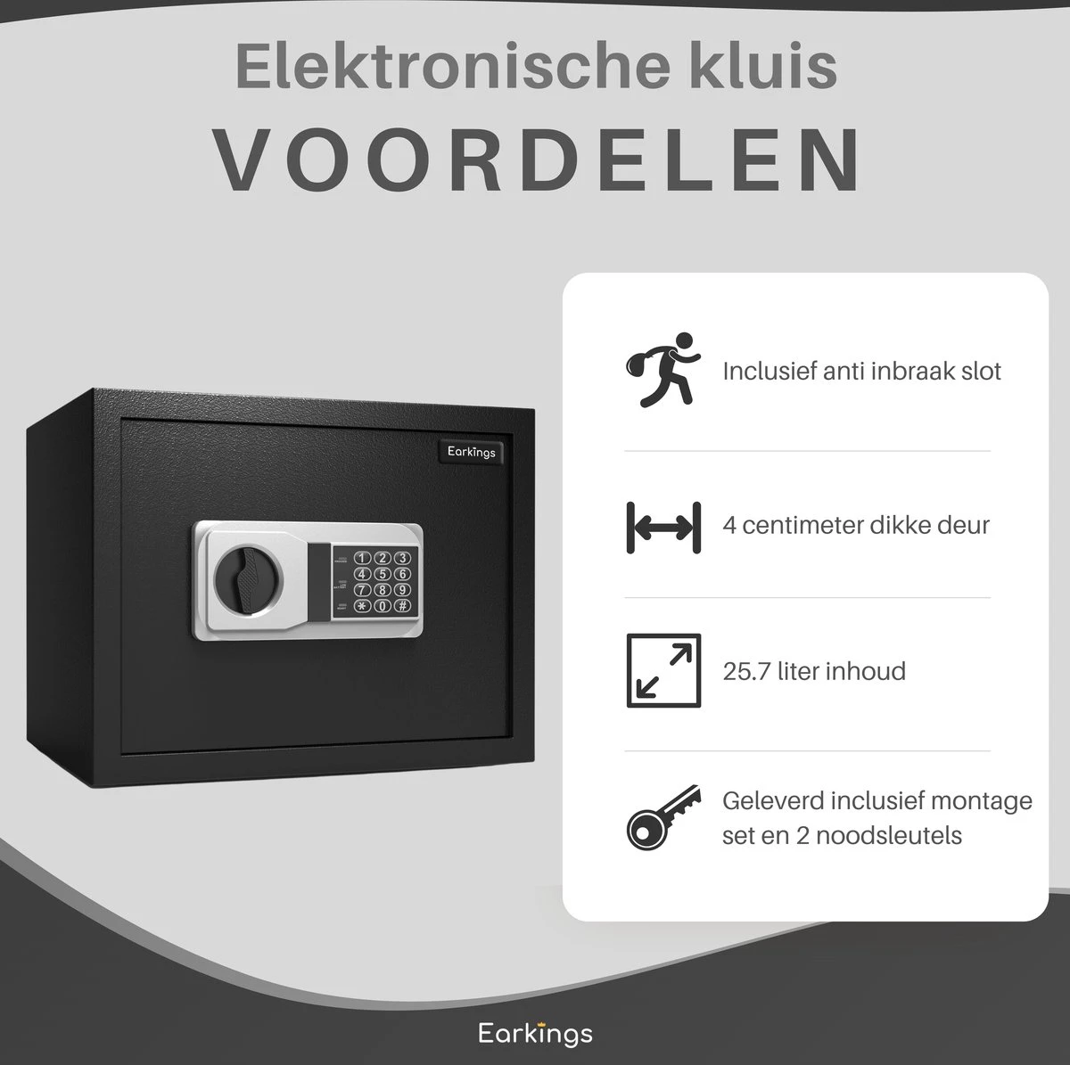 Ben je opzoek naar een veilige plek voor het opbergen van waardevolle en dierbare spullen? Denk hierbij aan documenten, sieraden, geld of andere waardevolle spullen. Dan is een kluis van Earkings ideaal voor jou. Onze elektronische kluis is gemaakt van premium materialen, heeft dikke wanden en een veiligheidsslot tegen inbraakgevaar en is daarmee uitermate geschikt om al jouw belangrijke spullen op te bergen!