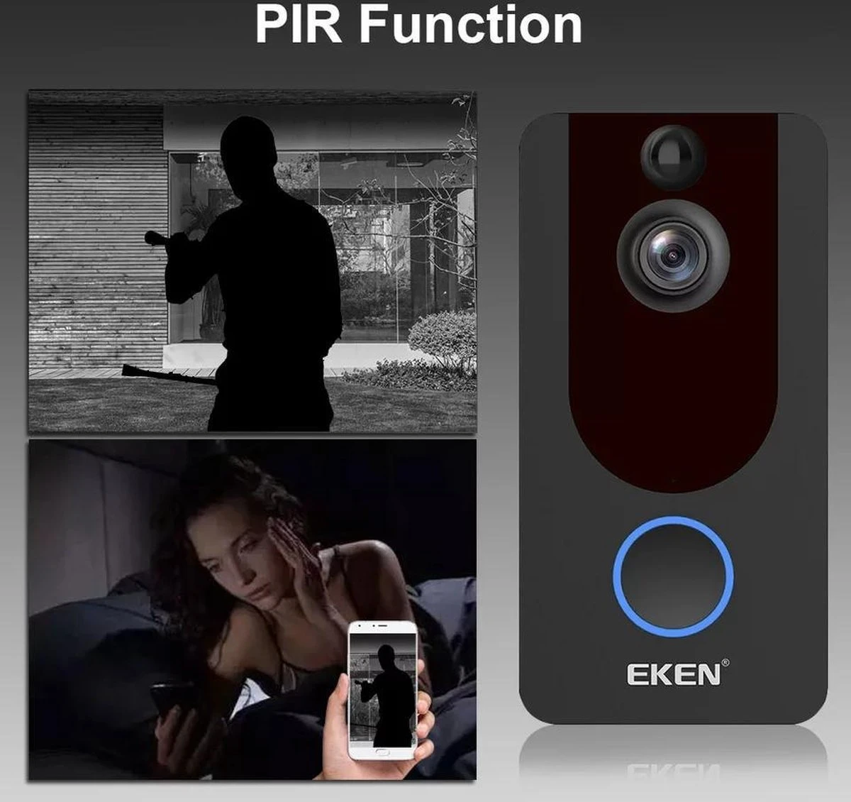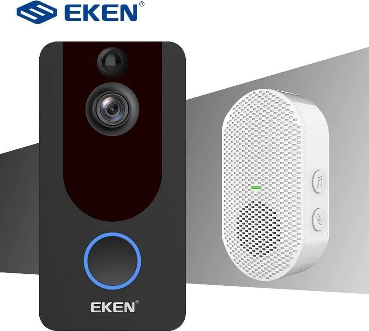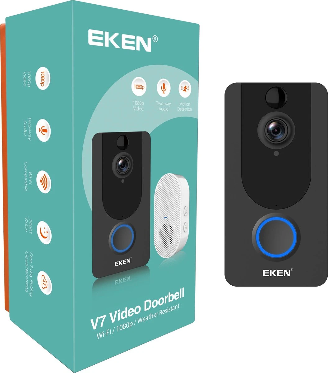 De EKEN Video Deurbel V7 is de nieuwste toevoeging in de V-serie van EKEN. Deze heeft een resolutie van 1080p en wordt geleverd inclusief gong en accu’s. Wil je altijd en overal kunnen zien wie er bij je voor de deur staat of er gedurende de dag heeft aangebeld? Dan is de EKEN V7Video deurbel de oplossing! Deze compacte video deurbel werkt op de WI-FI waardoor er geen kabels gelegd hoeven te worden. Via de HD camera kan je altijd zien wie er voor de deur staat voor je open doet. Dankzij de infrarood functie in de camera is het ook mogelijk in het donker te zien wie er voor de deur staat. Zodra er op de bel wordt gedrukt krijg je een melding op je smartphone en gaat de bijgeleverde gong in de woning ook af. Op dat moment kan je opnemen via je smartphone om te zien wie er voor de deur staat. Het is zelfs mogelijk om te communiceren met de persoon voor de deur dankzij de ingebouwde microfoon. Zodra er op de bel is gedrukt start de camera automatisch met het opnemen van beelden, zo kan je dus ook op een later moment terugkijken wie er allemaal hebben aangebeld. Verder werkt de deurbel op accu`s die worden bijgeleverd waardoor er geen stroomkabel aangelegd hoeft te worden. De video deurbel wordt geleverd met handleiding en is zeer makkelijk te installeren. Heeft u na uw bestelling nog vragen over de EKEN V7 Video deurbel dan helpen wij u natuurlijk graag verder.