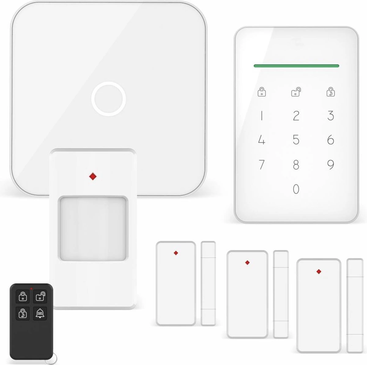 ✔ Compleet systeem met basis unit, controle paneel, bewegingsmelder, 3 raam/deur sensoren en een afstandsbediening