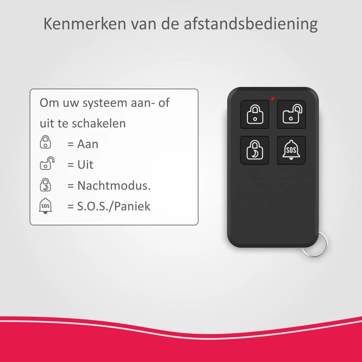 • Afstandsbediening: Voor het eenvoudig in- of uitschakelen van het alarmsysteem