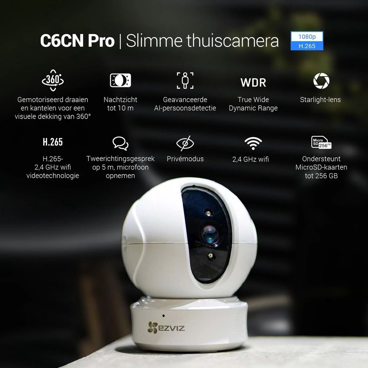 De C6CN PRO camera beschikt over een 2 megapixel 1080P sensor met een resolutie van 1920×1080 pixels. De camera beschikt over nachtzicht met een maximaal bereik van 10 meter en een vaste lens van 4mm met een beeldhoek van 81 graden. De camera kan kantelen en draaien. De camera is geschikt voor gebruik binnen en heeft een ingebouwde microfoon en luidspreker voor 2-weg audio. De camera kan worden verbonden via een WiFi verbinding of met een netwerkkabel worden aangesloten op het netwerk.