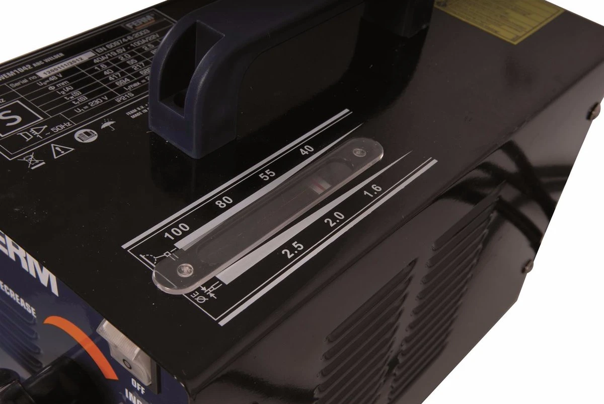 De WEM1042 is een compact 230V lasapparaat van FERM met een maximale lasstroom van 100 Ampère. Het lasapparaat is voorzien van ventilatorkoeling en thermische overhittingsbeveiliging met controlelamp, zodat het geen probleem is hem zwaar en langdurig te gebruiken.