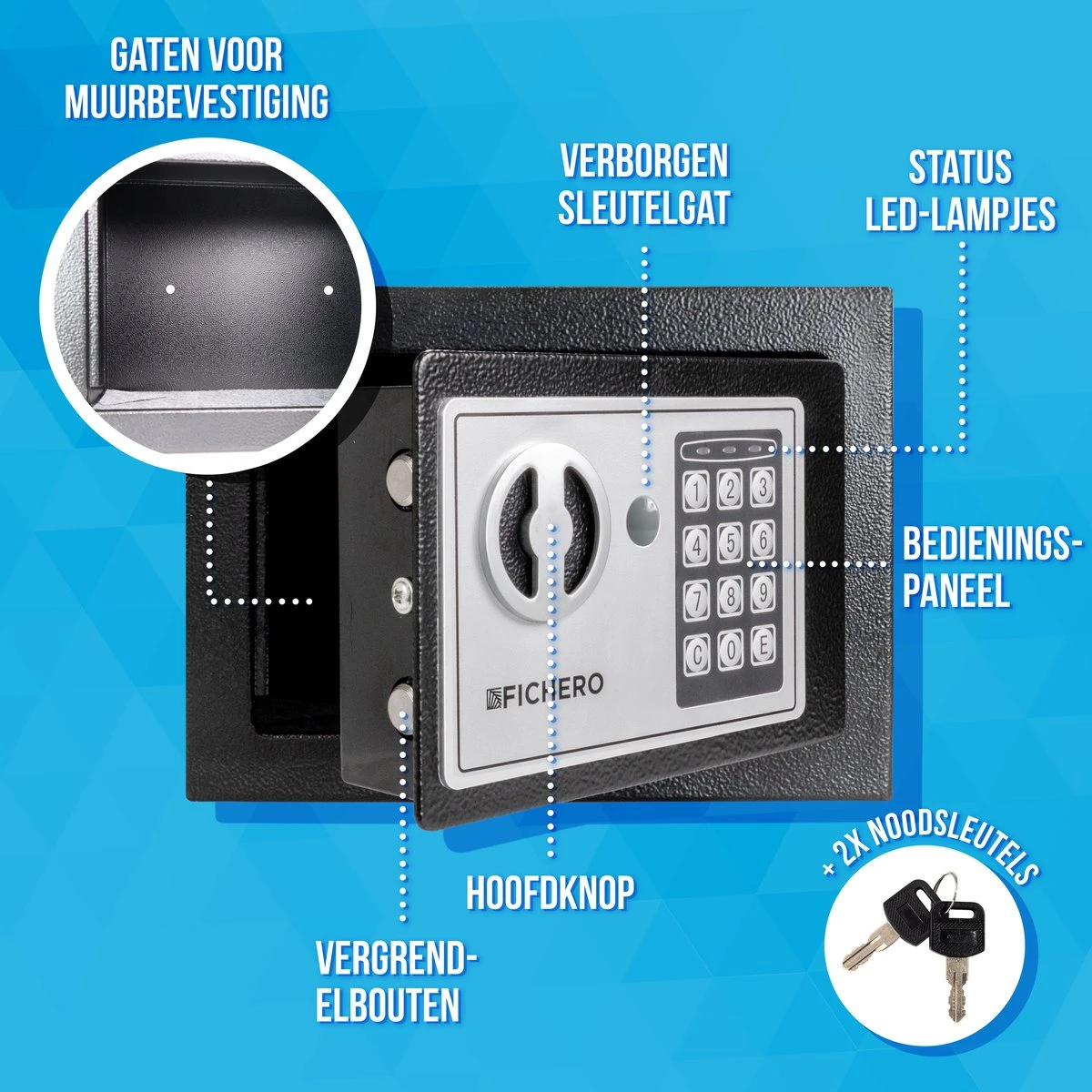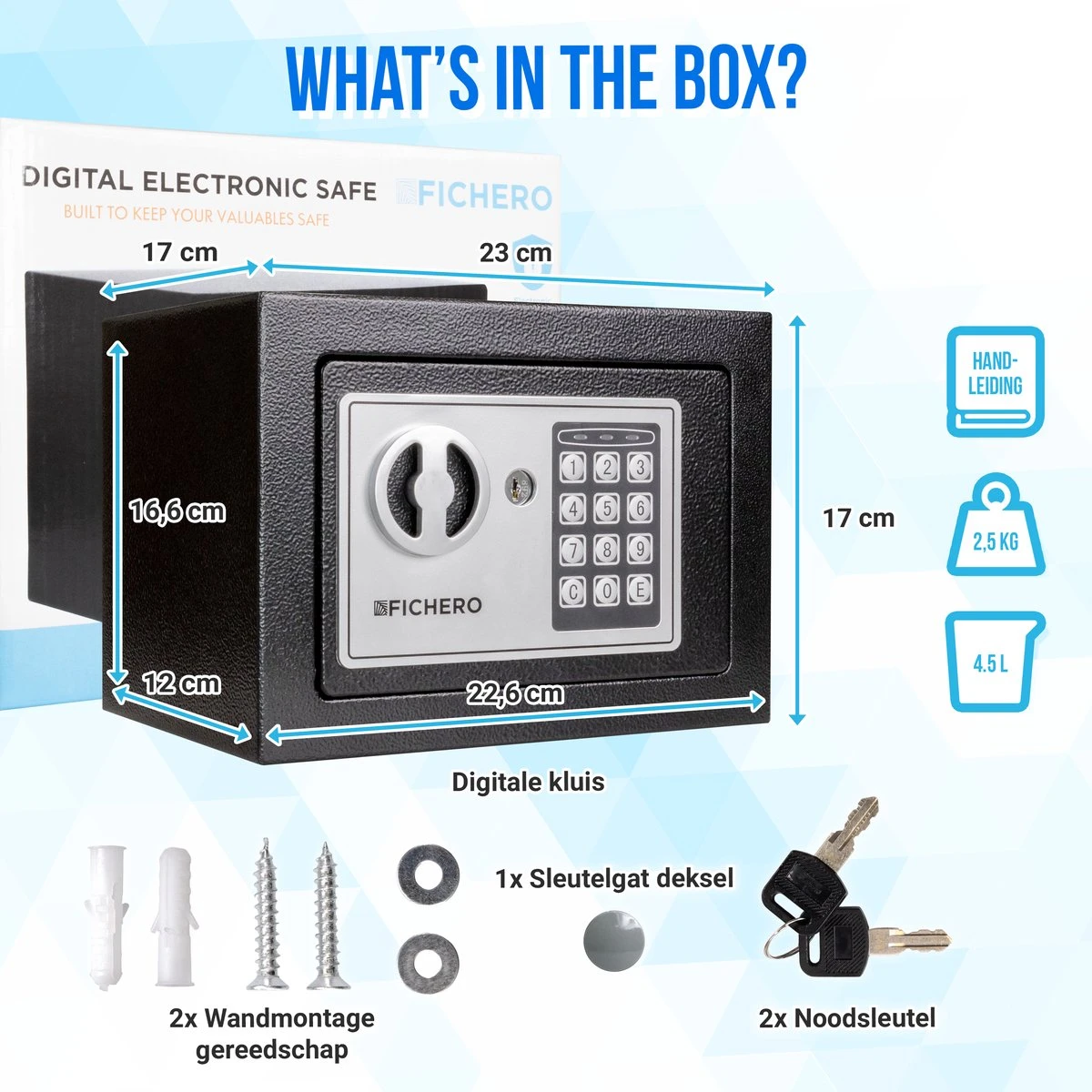 De fichero digital electronic safe werkt op batterijen en heeft 3 indicator lampjes: groen (kluis is open), rood (batterij bijna leeg) en geel (waarschuwing). Hij is gemaakt van massief staal en weegt 2,5 kg. Je kunt zelf een 3 tot 8-cijferige code verzinnen. Bij het vergeten van de code gebruik je de bijgevoegde noodsleutels.