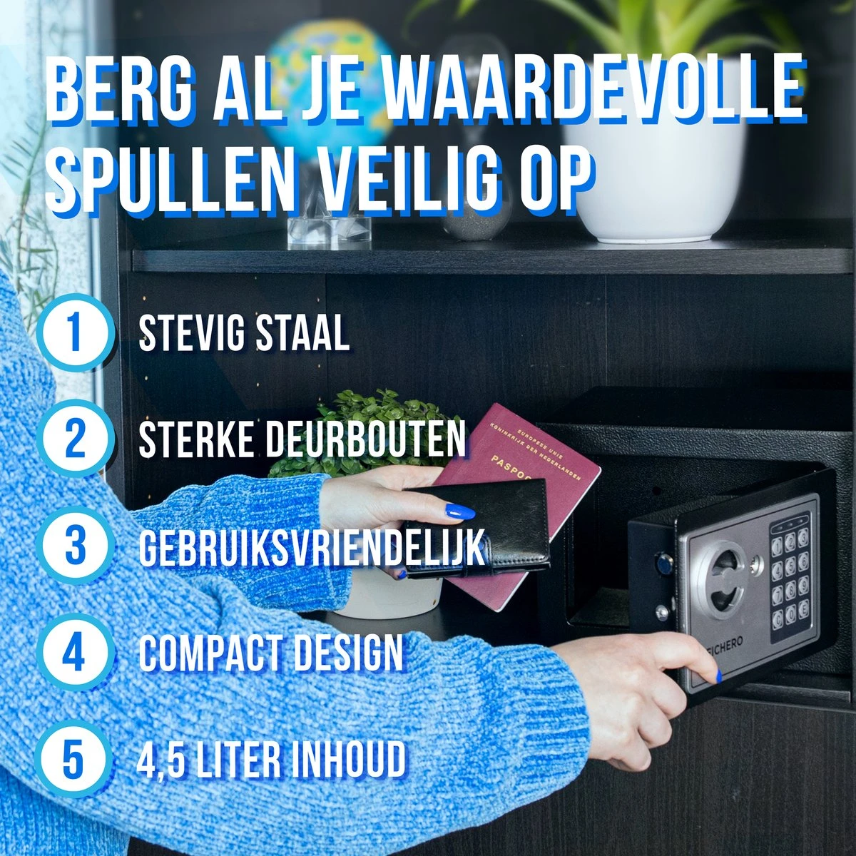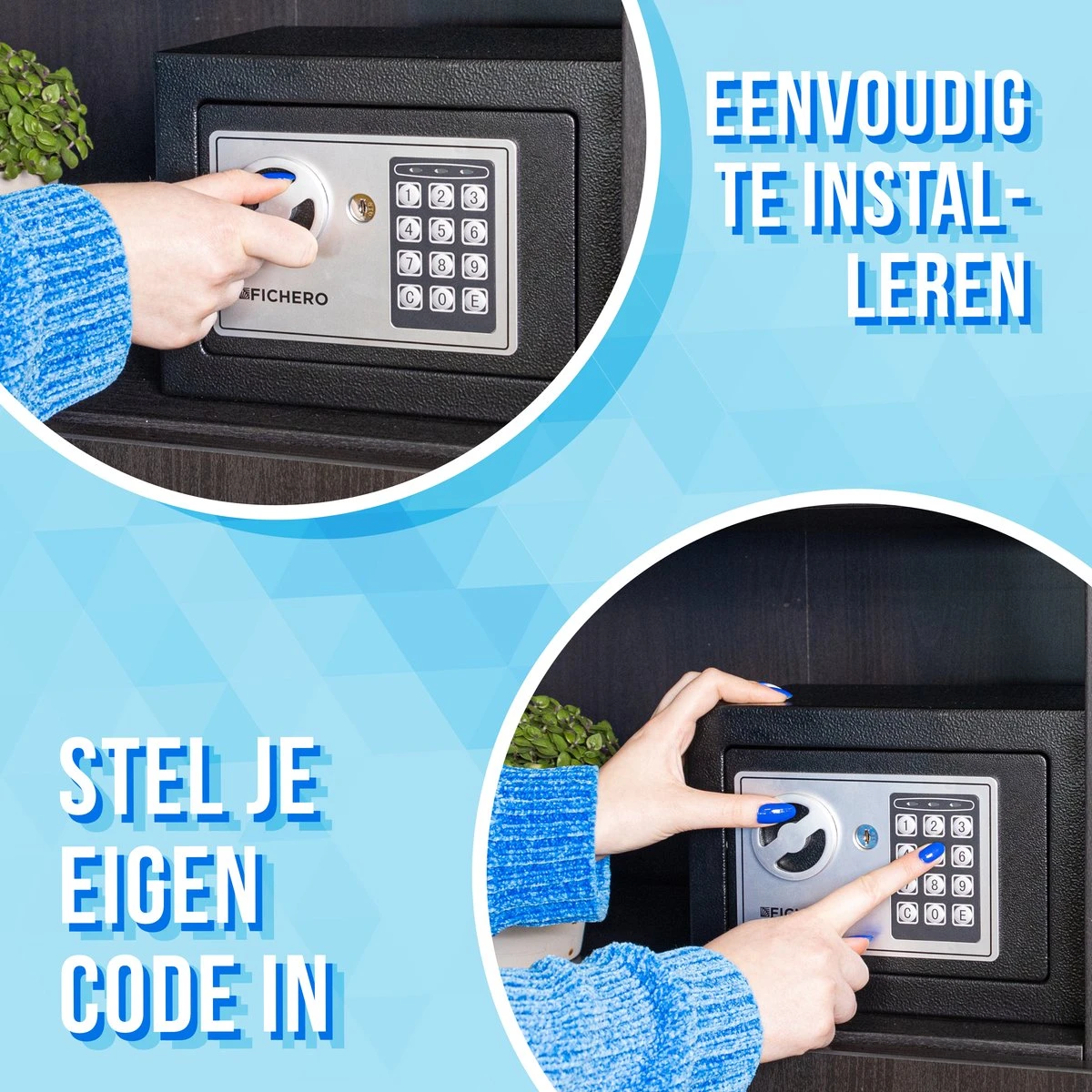 Iedereen heeft wel waardevolle papieren, belangrijke documenten, sieraden of contant geld in huis of op kantoor. Dit laat je natuurlijk liever niet open en bloot op tafel liggen. Met de Fichero digital electronic safe zijn al je kostbare spullen netjes en veilig opgeborgen. De kluis heeft een degelijk en stoer design, een elektronisch sluitsysteem en is ook aan de muur te bevestigen.