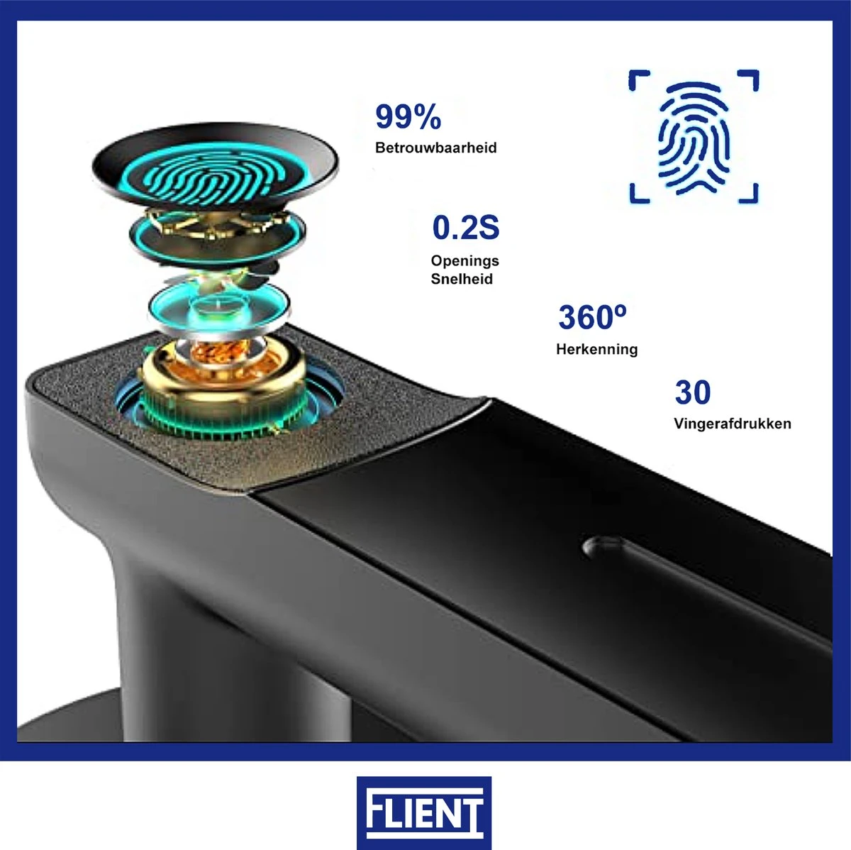 De slimme deurklink van Flient kan tot 30 verschillende vingerafdrukken herkennen en heeft een batterijcapaciteit van 300.000 gebruikershandelingen. De deur gaat automatisch weer op slot en heeft een status indicator voor het slot. De kans dat het slot van de slimme deurklink open gaat voor iemand die niet in het systeem staat is 0%