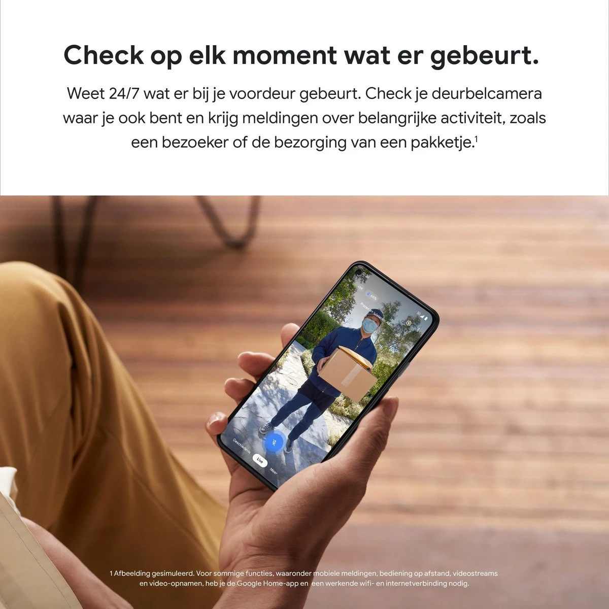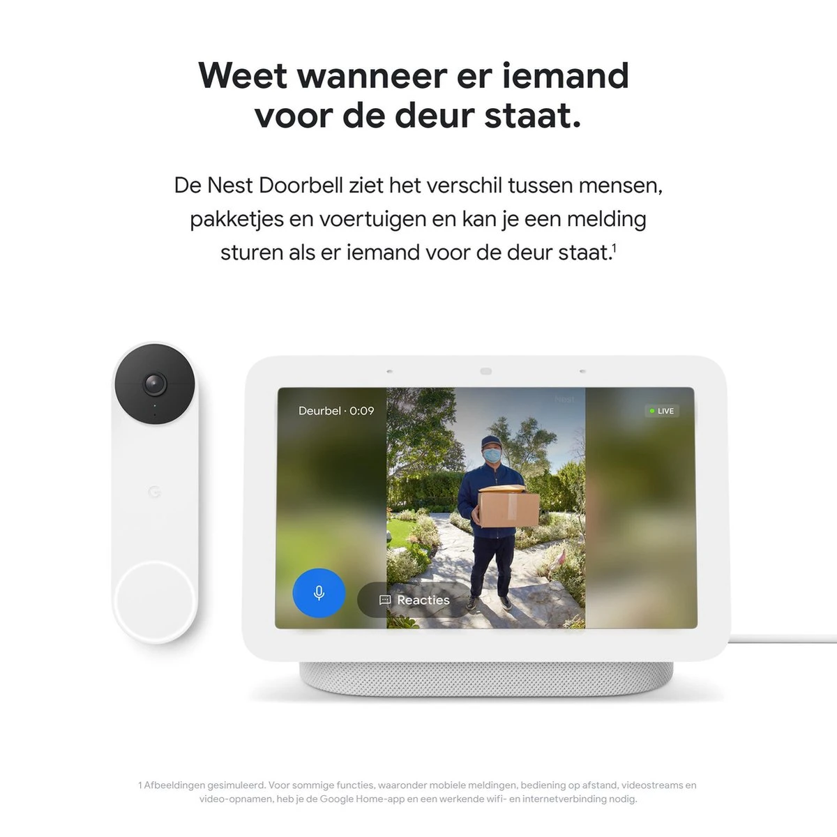 *Voor sommige functies, waaronder mobiele meldingen, bediening op afstand, videostreams en video-opnamen, heb je de Google Home-app en een werkende wifi- en internetverbinding nodig