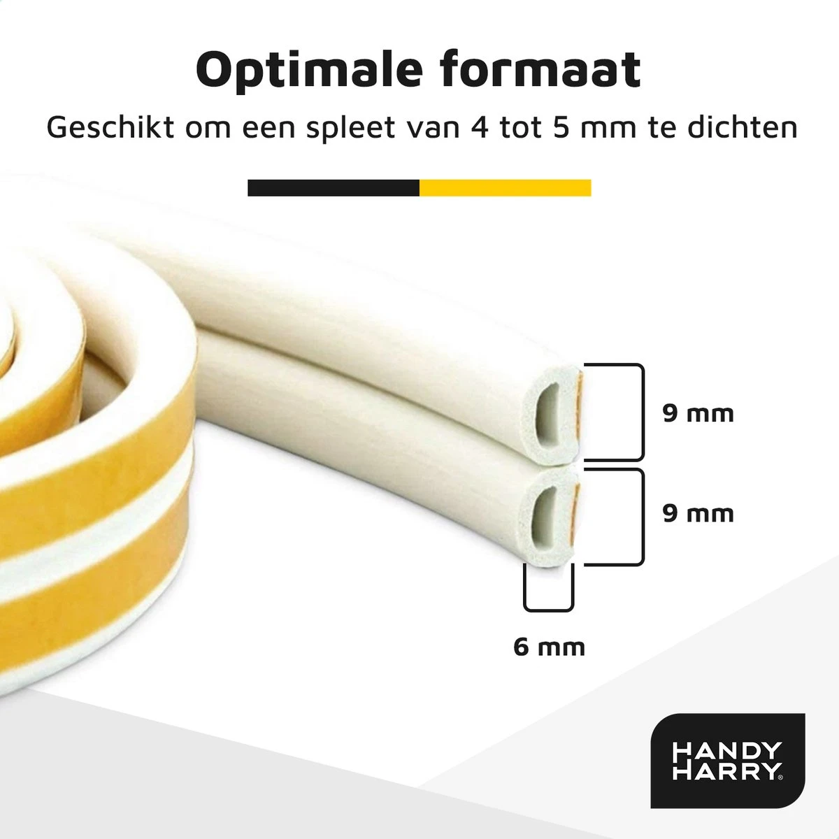 De tochtband meet 2.5 meter, maar bestaat uit 2 parallelle strips. Hierdoor bedraagt de totale lengte eigenlijk 5 meter. De individuele band is 9mm breed en is met zijn dikte van 6mm geschikt om een tochtspleet van 4-5 mm te dichten. - IDEAAL VOOR RAMEN EN DEUREN