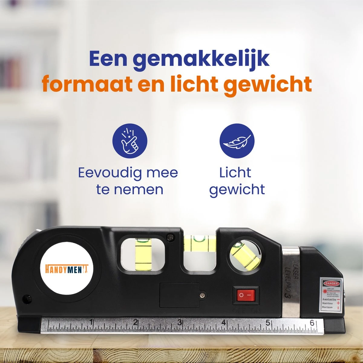 De Laser Waterpas van Handymen biedt alles in één. Met deze Laser Waterpas meet u gemakkelijk alle afstanden op, en kijkt u direct of alles waterpas staat terwijl u bezig bent. Ieder huishouden zou er één moeten hebben. Het komt altijd van pas, van het ophangen van een schilderij tot het rechtzetten van de wasmachine of verstellen van de tafel.