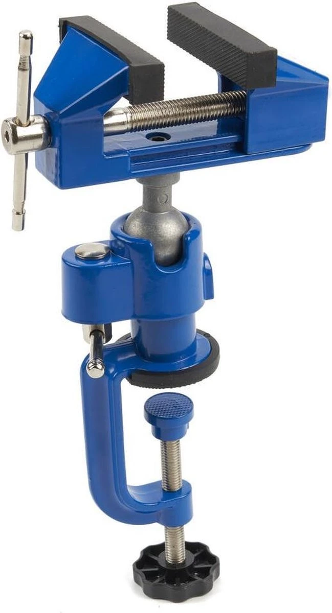 Sterke klem bankschroef. 70 mm rubberen kaken met 50 mm openingscapaciteit. 360° draaibare kop met een 45° kantelcapaciteit. Rubberen tafel bescherming voorkomt markeringen.