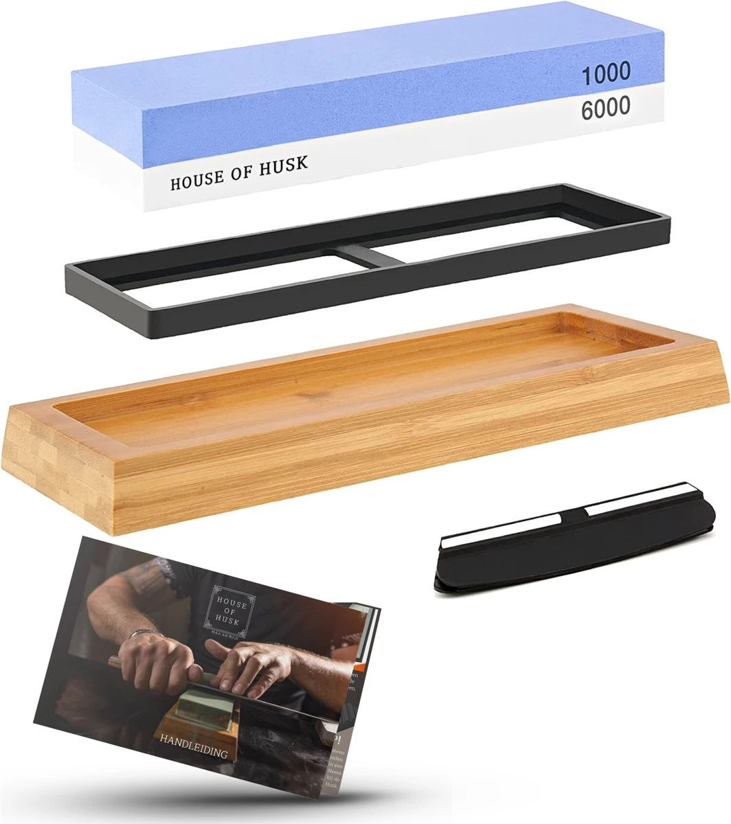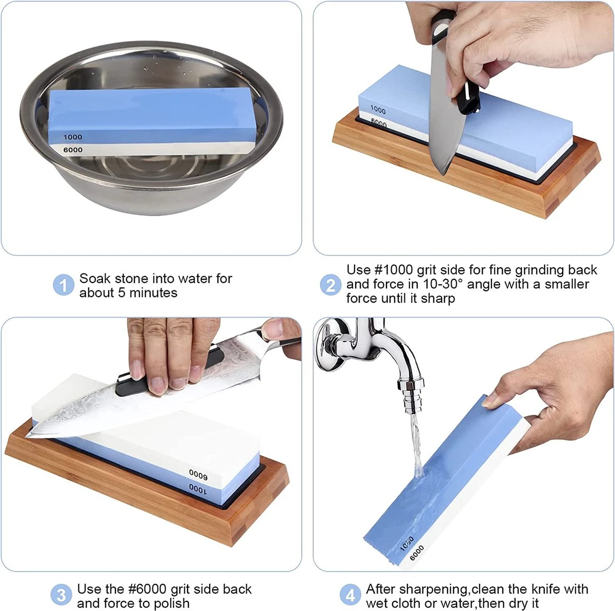 - Korrel Is Nauwkeurig: 1 wetsten, 2 kanten korrel 1000/6000. kies de juiste korrelsteen volgens uw mesbehoeften. 1000 grit wordt meestal gebruikt om messen met afgebroken randen te repareren en botte messen te slijpen. 6000 grit gebruikt om de snede te verfijnen en extra fijne afwerking/polijsting van uw messen te geven.