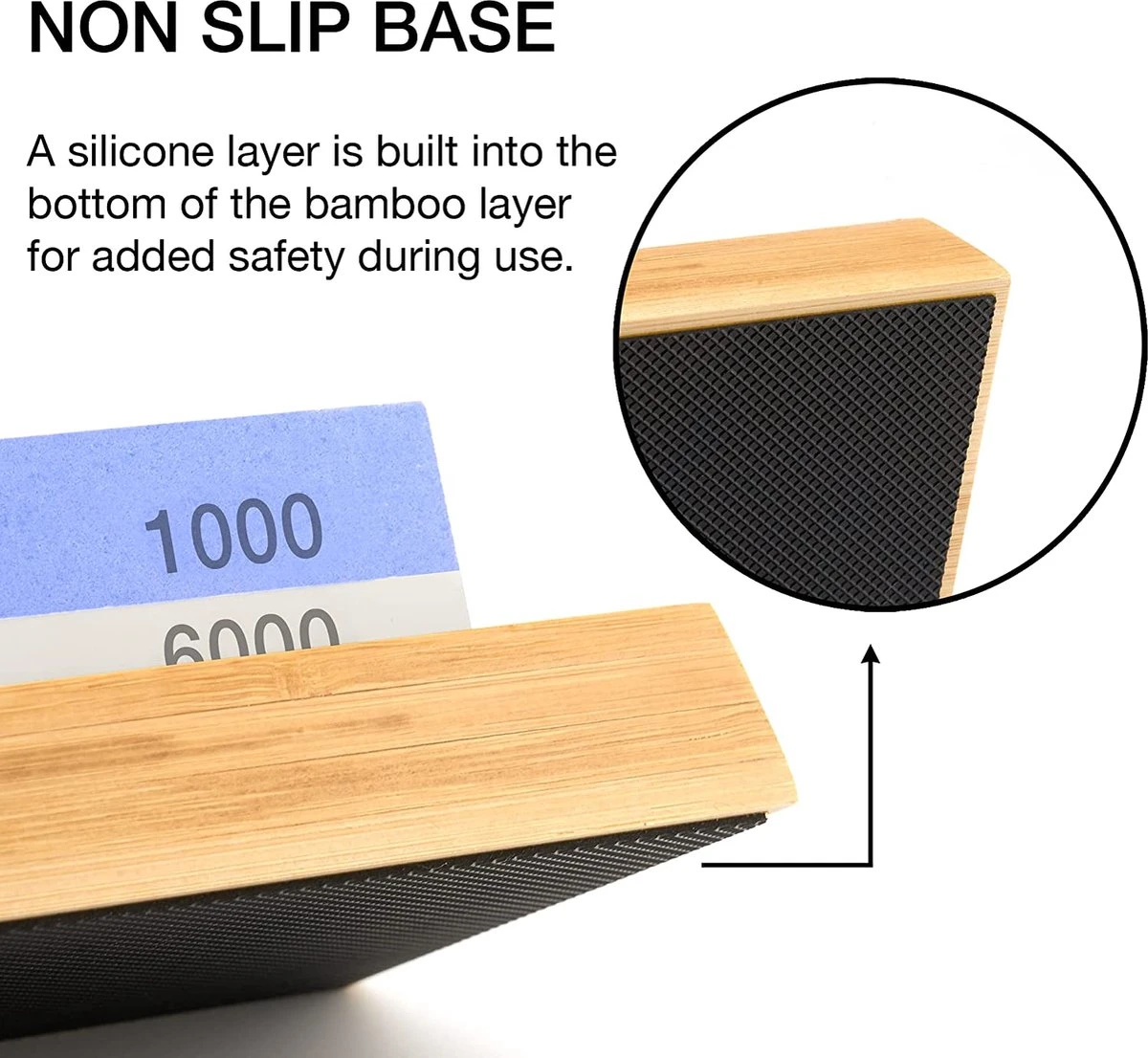 - Veiligheidsslijpen: we begrijpen het belang van veiligheid bij het werken met slijpgereedschappen. Bamboe basis zorgt voor een stabiel platform en de achterkant van de basis heeft een rubberen steun, die de balans houdt en niet verschuift tijdens het slijpproces. Elke wetsteen wordt geleverd met een siliconen houder die voor het bevestigen van de wetsteen en het vasthouden van de steen in een antislip bamboebasis. Hoekgeleiders zorgen voor precisie en consistentie. Gebruik deze wetsteen slijpset om het risico te minimaliseren.