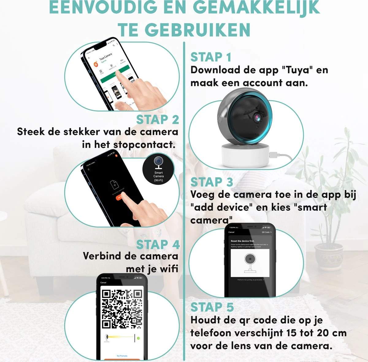 De handige app genaamd Tuya is te downloaden voor Apple en Android. Deze app is zeer makkelijk in gebruik. Volg simpelweg de stappen die worden aangegeven in de app en voor je het weet kan je met gemak gebruik maken van de camera en alles in de gaten houden.
