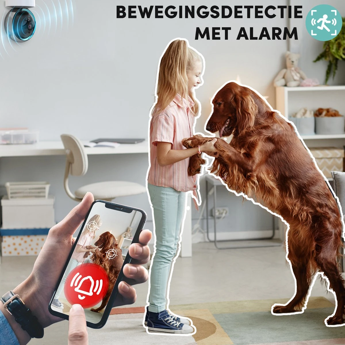 U kunt instellen dat de camera bewegende objecten of personen blijft volgen. Via één klik op de knop heeft u dit geregeld. Wandelt uw huisdier naar de andere kant van de kamer? De camera herkent dit automatisch en draait met de bewegingen van uw huisdier mee. Uiteraard krijgt u hiervan direct een melding op uw telefoon en worden de beelden opgeslagen op uw SD kaart of in de Cloud.